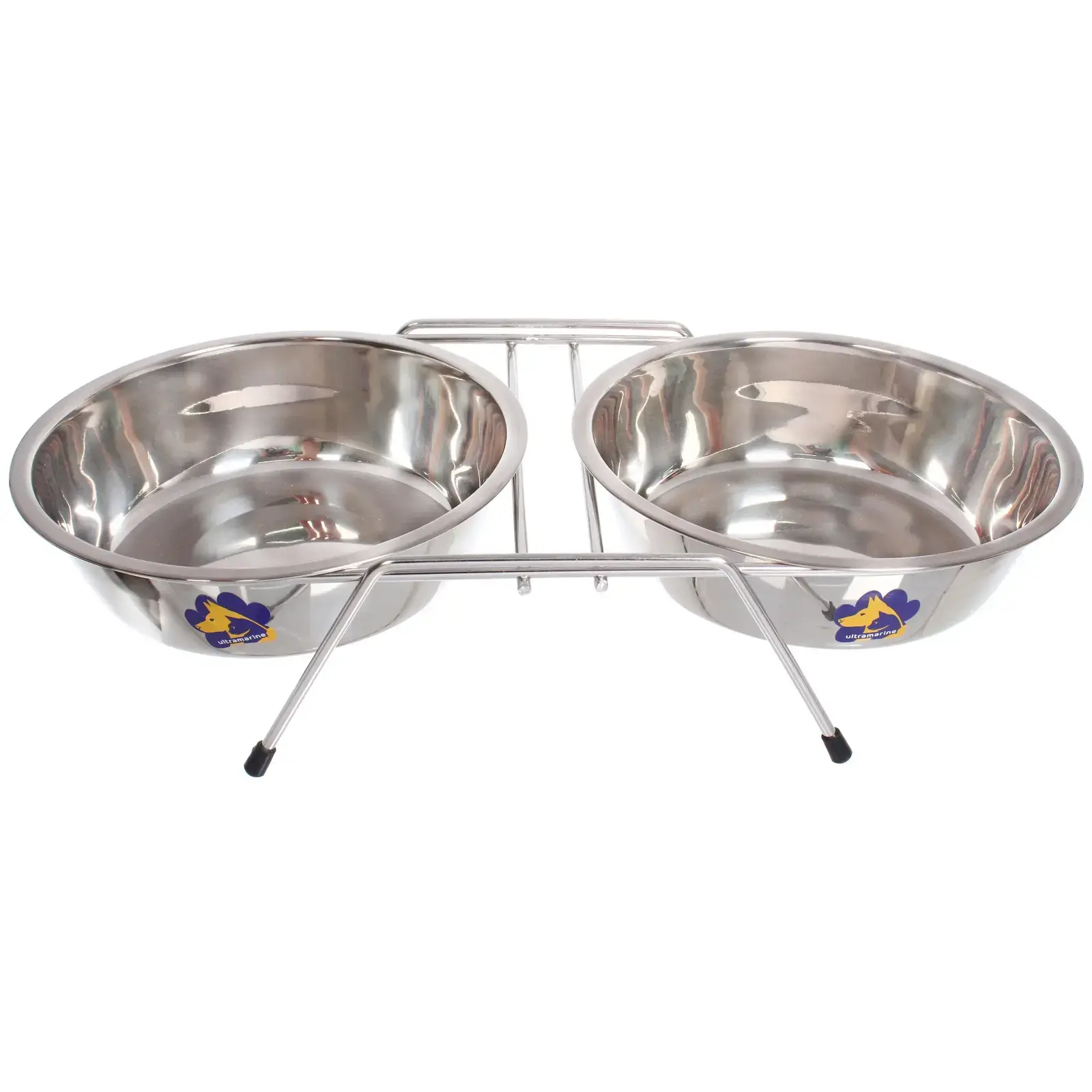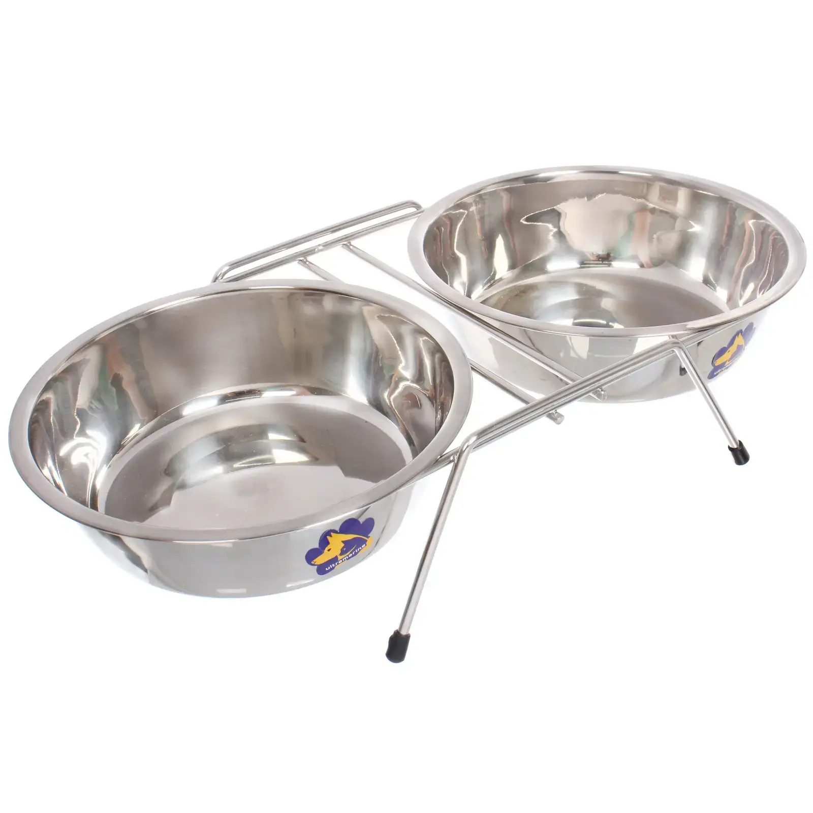 Миски выполнены из нержавеющей стали, что гарантирует их долговечность и легкость в уходе. Они имеют гладкую зеркальную поверхность, что не только красиво, но и практично — легко очищается от загрязнений. Подставка, на которой расположены миски, обеспечивает их устойчивость и предотвращает скольжение, благодаря резиновым накладкам на ножках.