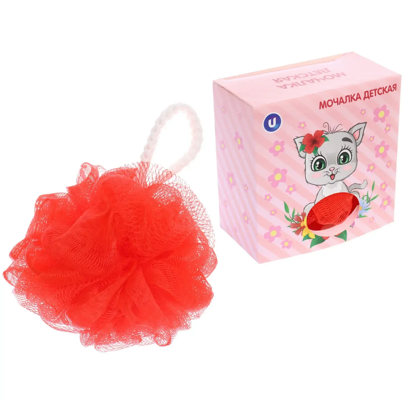 Размер мочалки составляет 10 см в диаметре, что делает её компактной и удобной для хранения. Упаковка выполнена в ярких цветах и оформлена с изображением милого котенка, что добавляет товару привлекательности. Мочалка весит всего 30 граммов, что делает её легкой и удобной для использования даже самыми маленькими детьми.