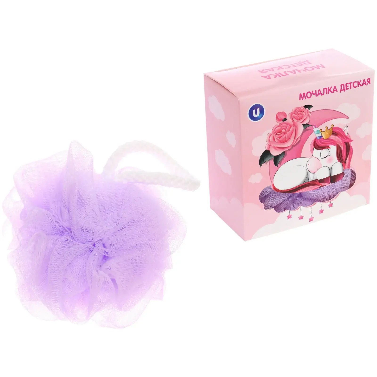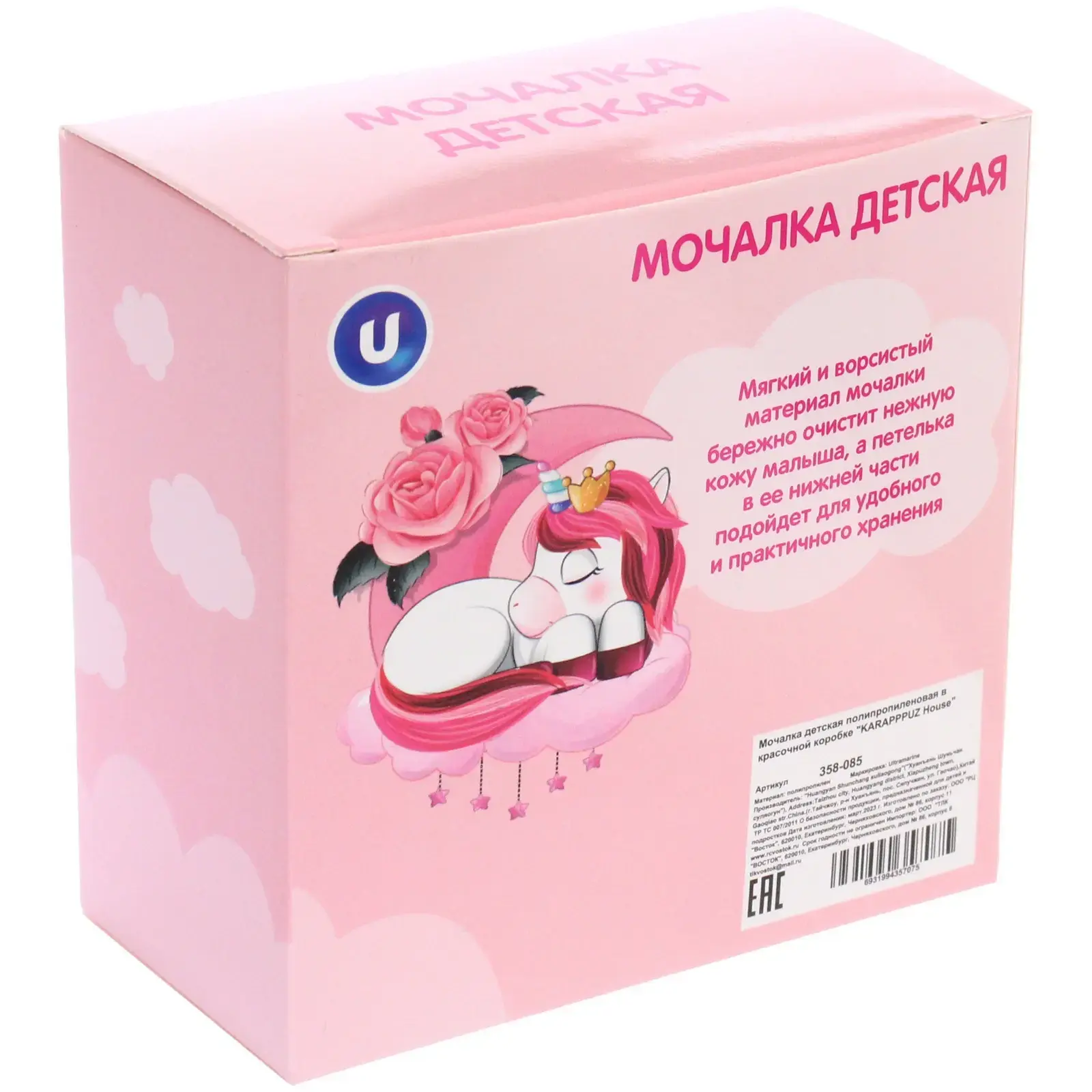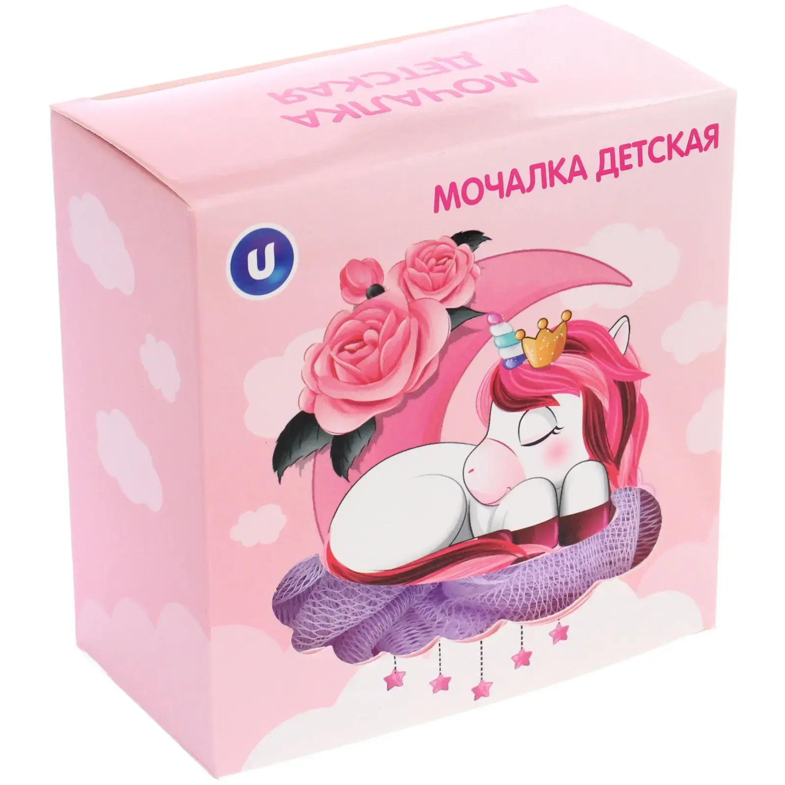 Размер мочалки составляет 10 см в диаметре, что делает ее компактной и удобной для хранения. Упаковка выполнена в ярком розовом цвете с изображением единорога, что добавляет игривости и радости в процесс купания. Мочалка весит всего 30 граммов, что делает ее легкой и удобной для использования детьми.