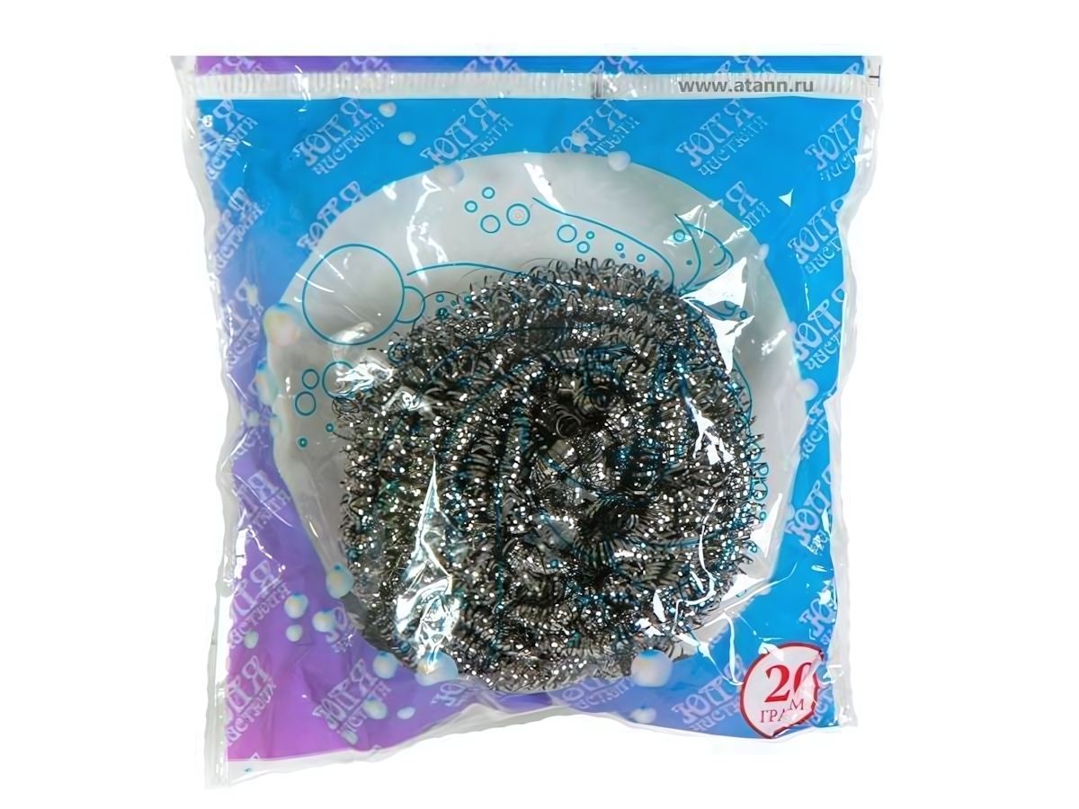 Серебристый цвет мочалки придаёт аккуратный вид и эстетичность даже после длительного использования. Упакована в герметичную прозрачную упаковку, что защищает изделие до момента использования. Благодаря небольшому весу и размеру, мочалка легко помещается в ящик или контейнер для кухонных аксессуаров.