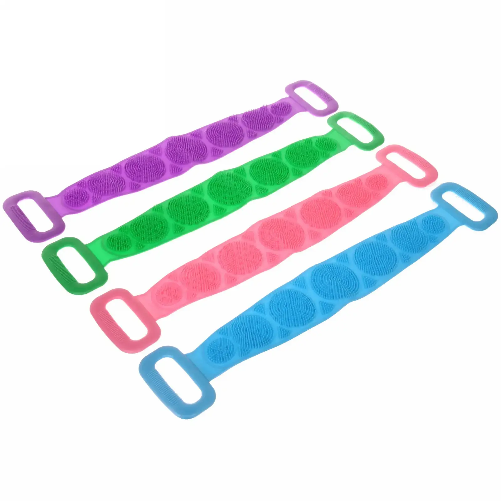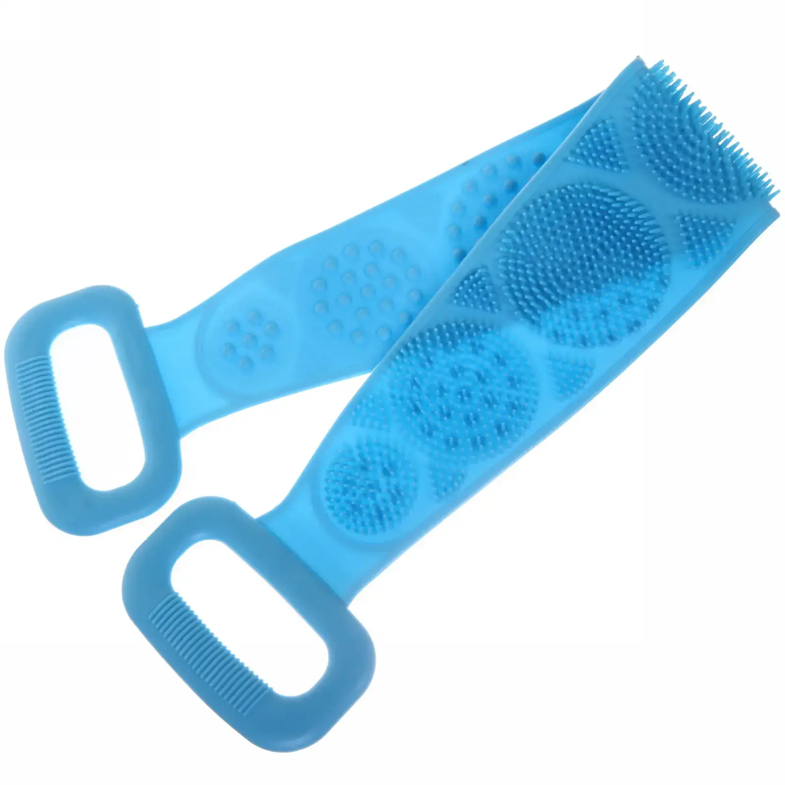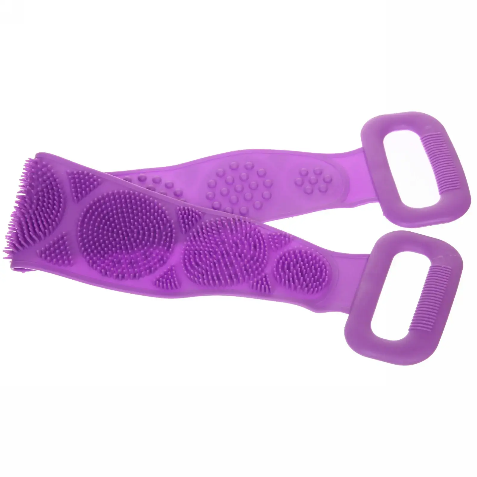 Мочалка имеет длину 60 см и ширину 11 см, что делает её удобной для захвата и использования. Две ручки обеспечивают надежный хват, позволяя легко мыть труднодоступные участки тела. Массажные элементы на поверхности мочалки способствуют улучшению кровообращения и расслаблению мышц, что делает процесс мытья не только гигиеничным, но и приятным.