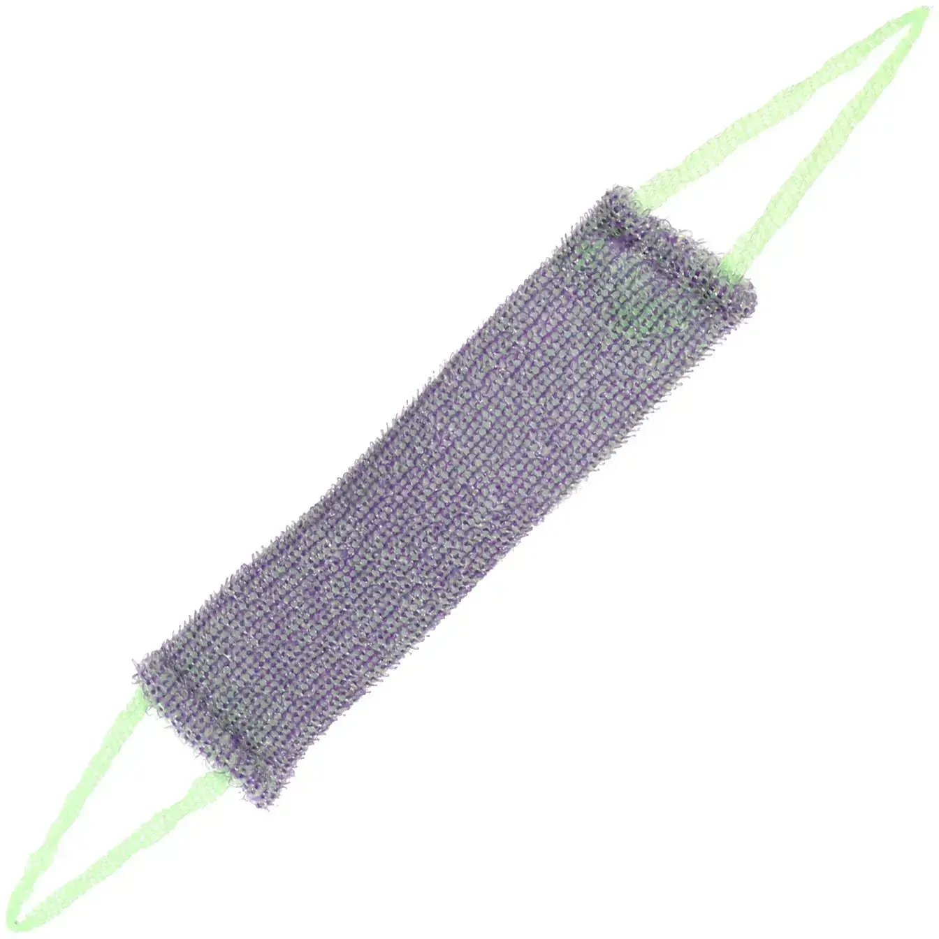 Размер мочалки составляет 42х11 см, что делает её удобной для использования. Основной цвет — фиолетовый, с включениями синего и розового оттенков, что придаёт ей привлекательный вид. Мочалка легко очищается и быстро сохнет, что делает её практичным выбором для повседневного использования.