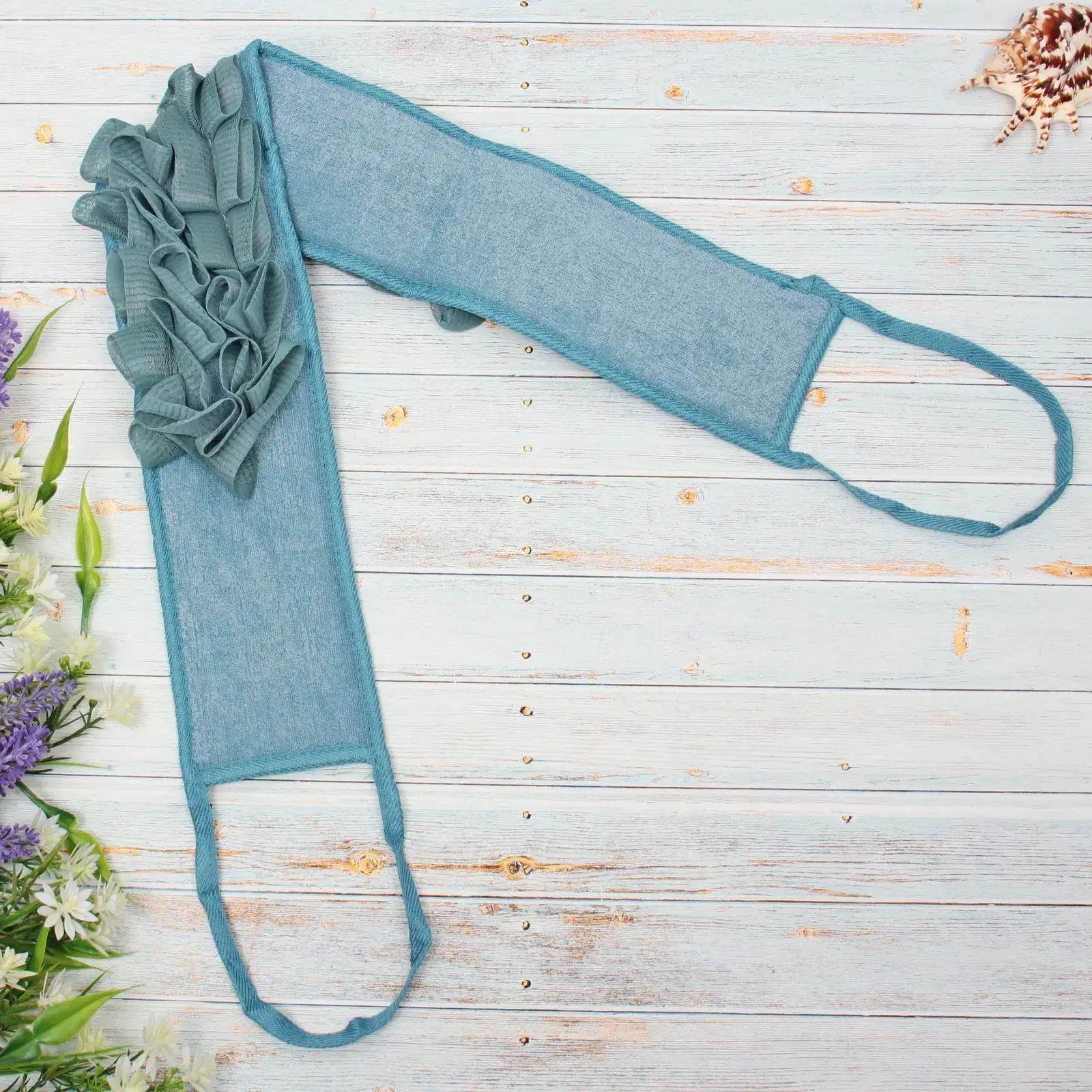 Мочалка имеет длинные ручки, что позволяет легко дотянуться до труднодоступных мест на теле. Двухслойная структура обеспечивает мягкость и деликатность при использовании, а также эффективное очищение кожи. Она идеально подходит для ежедневного использования, а также для расслабляющих процедур в ванной.