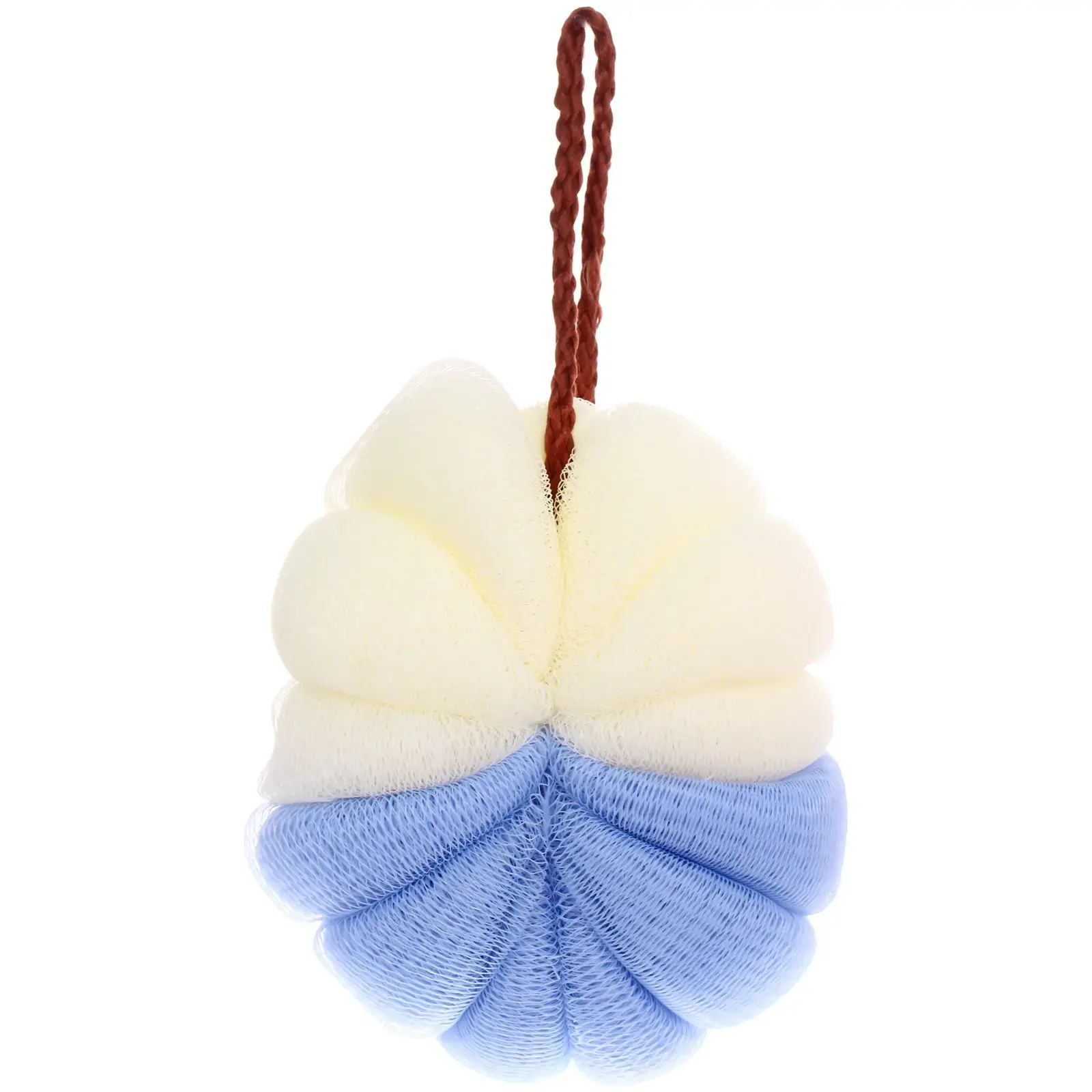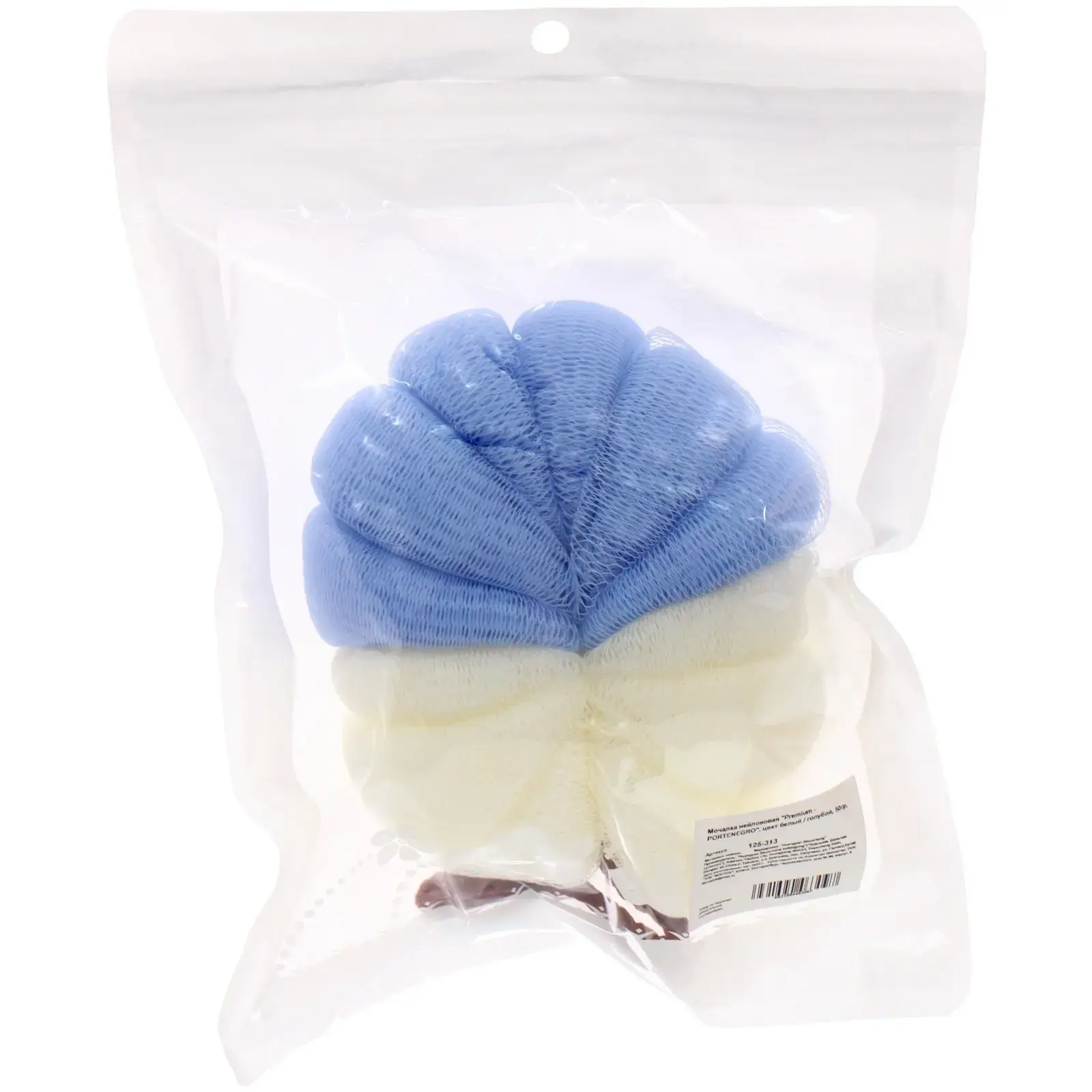 Мочалка выполнена из нейлона, что обеспечивает её долговечность и устойчивость к износу. Цветовая гамма включает белый и голубой оттенки, что делает её визуально привлекательной. Упаковка с зип-замком позволяет удобно хранить мочалку и защищает её от загрязнений. Размеры мочалки не указаны, но она подходит для комфортного использования в ванной.