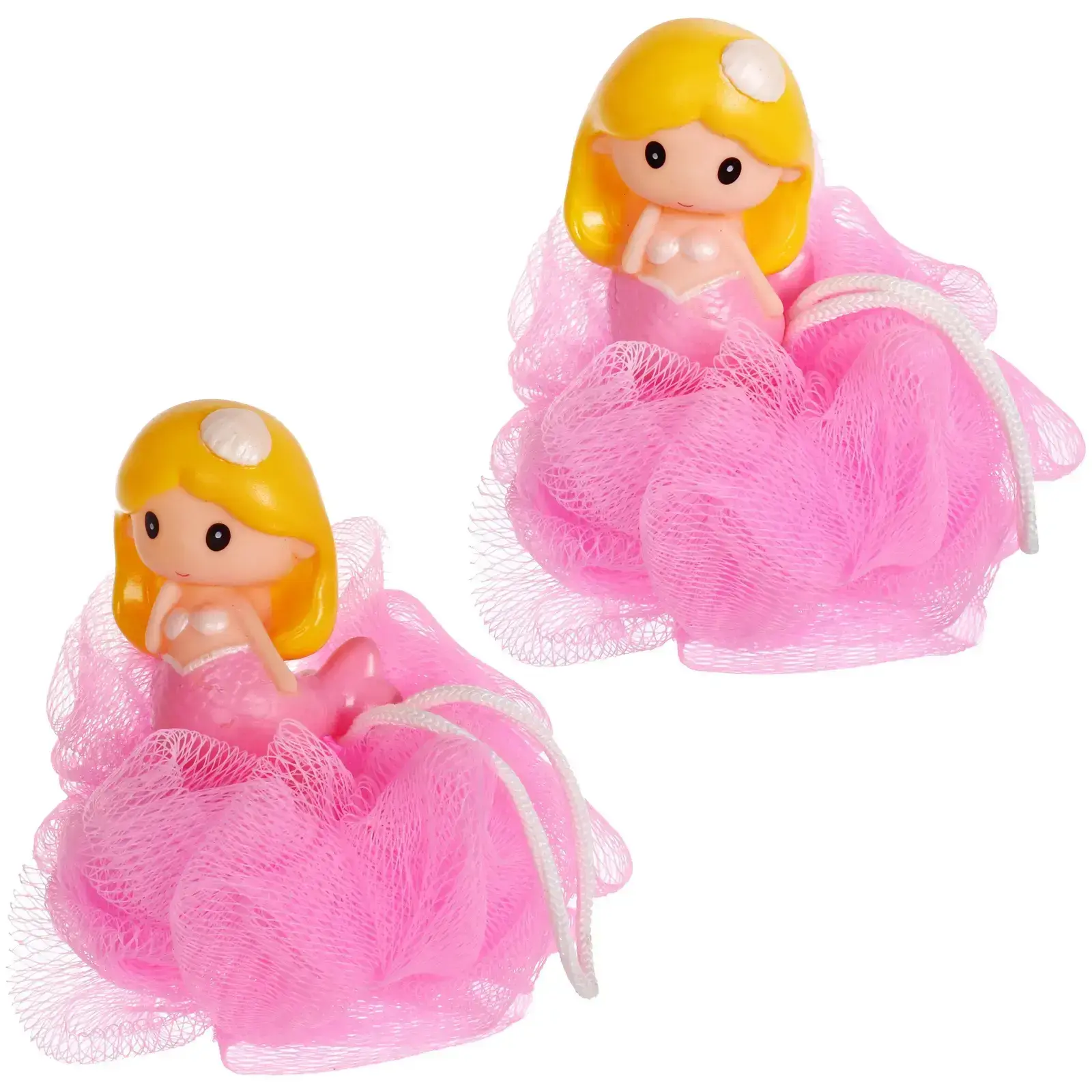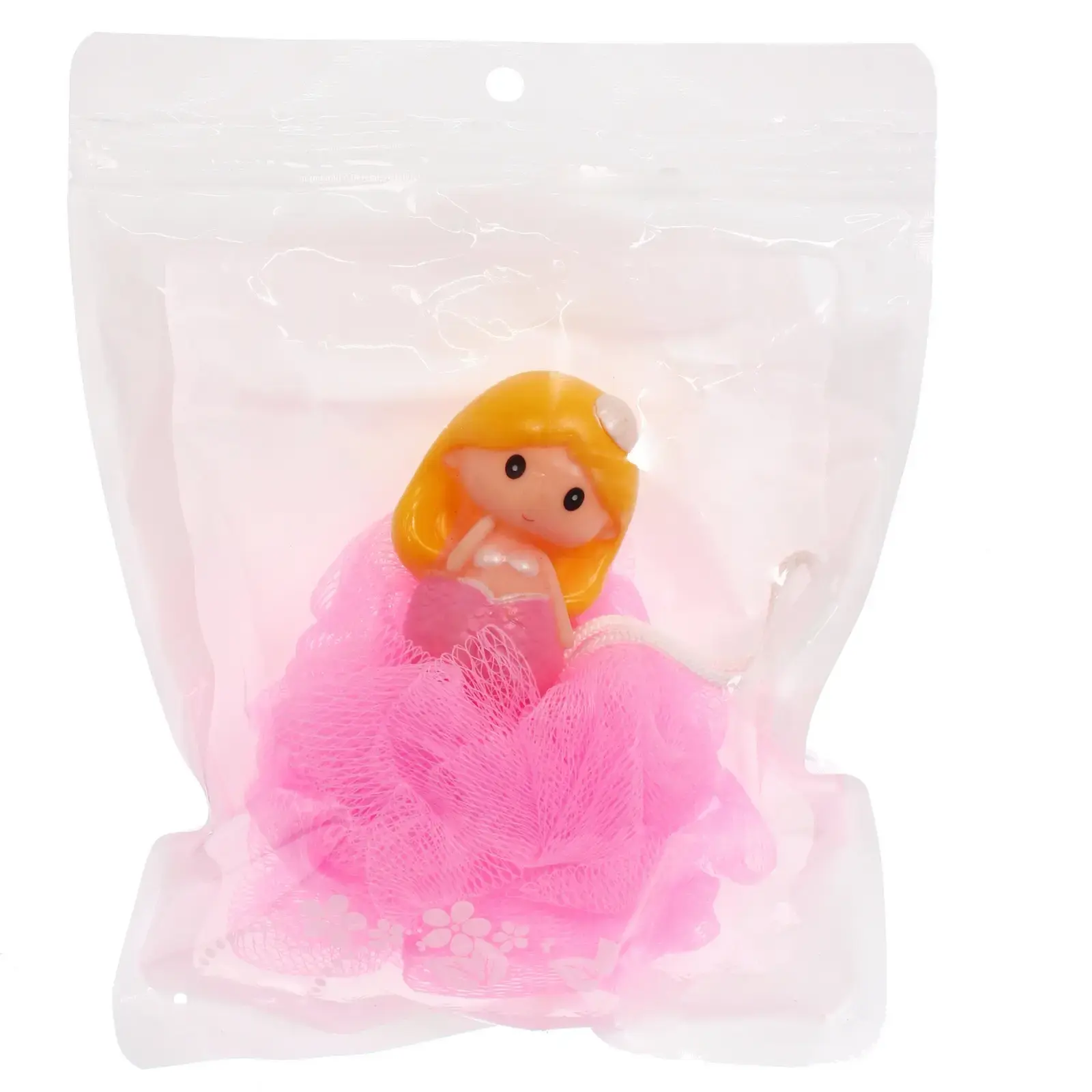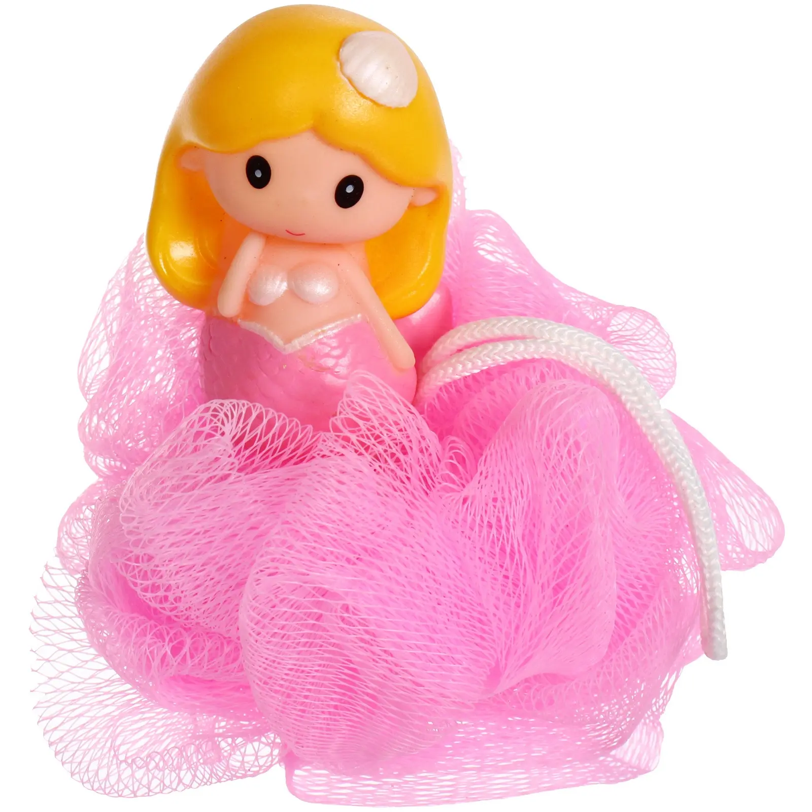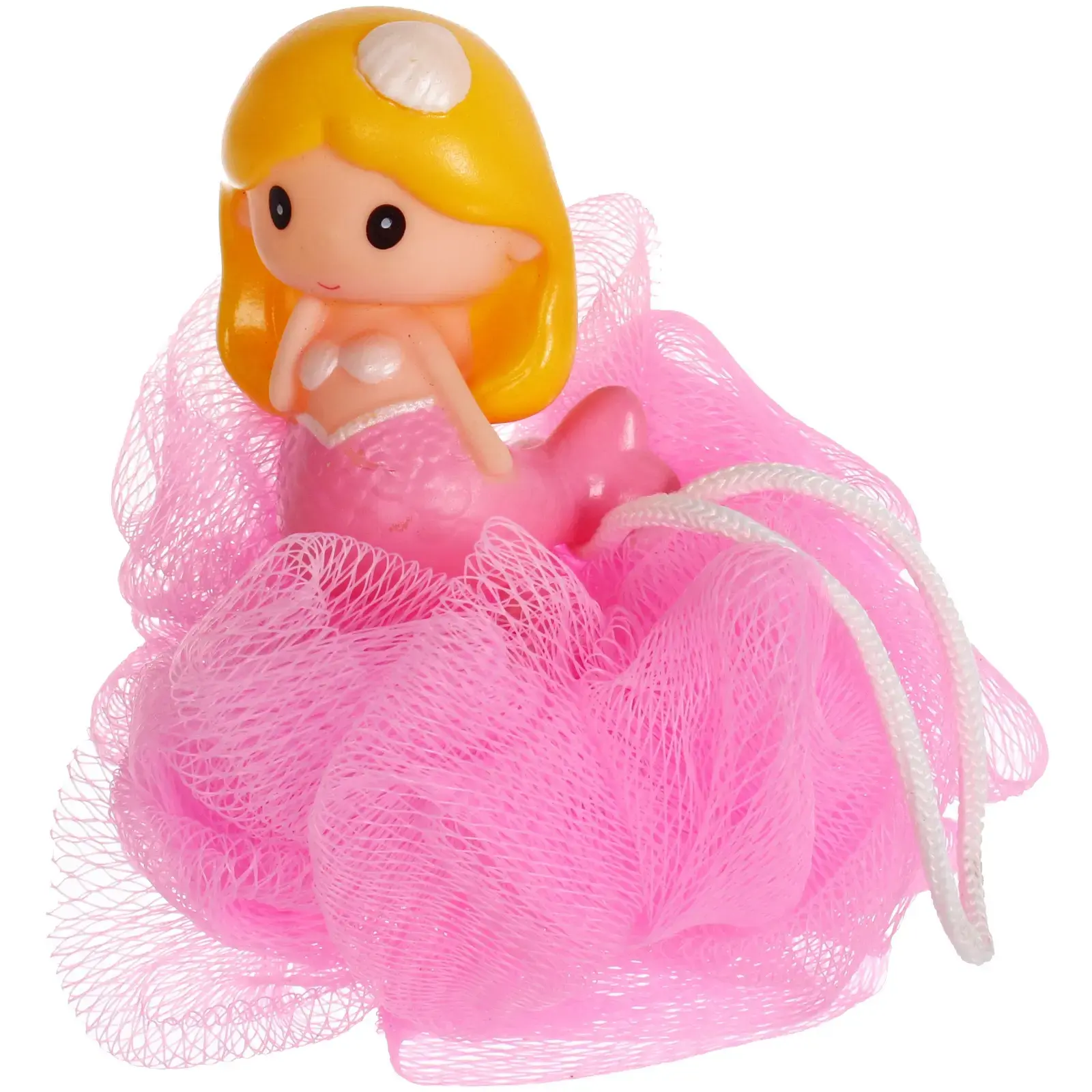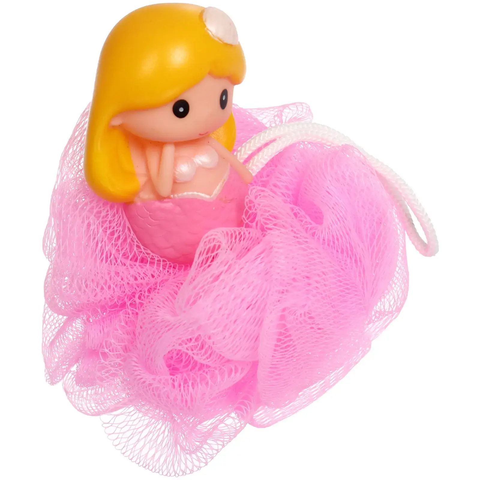 Мочалка имеет диаметр 11 см и весит всего 20 граммов, что делает ее легкой и удобной для детей. Яркий розовый цвет и оригинальный дизайн в виде русалки привлекают внимание и делают процесс купания более веселым. Мочалка также оснащена белой веревочкой для подвешивания, что позволяет удобно хранить ее после использования.
