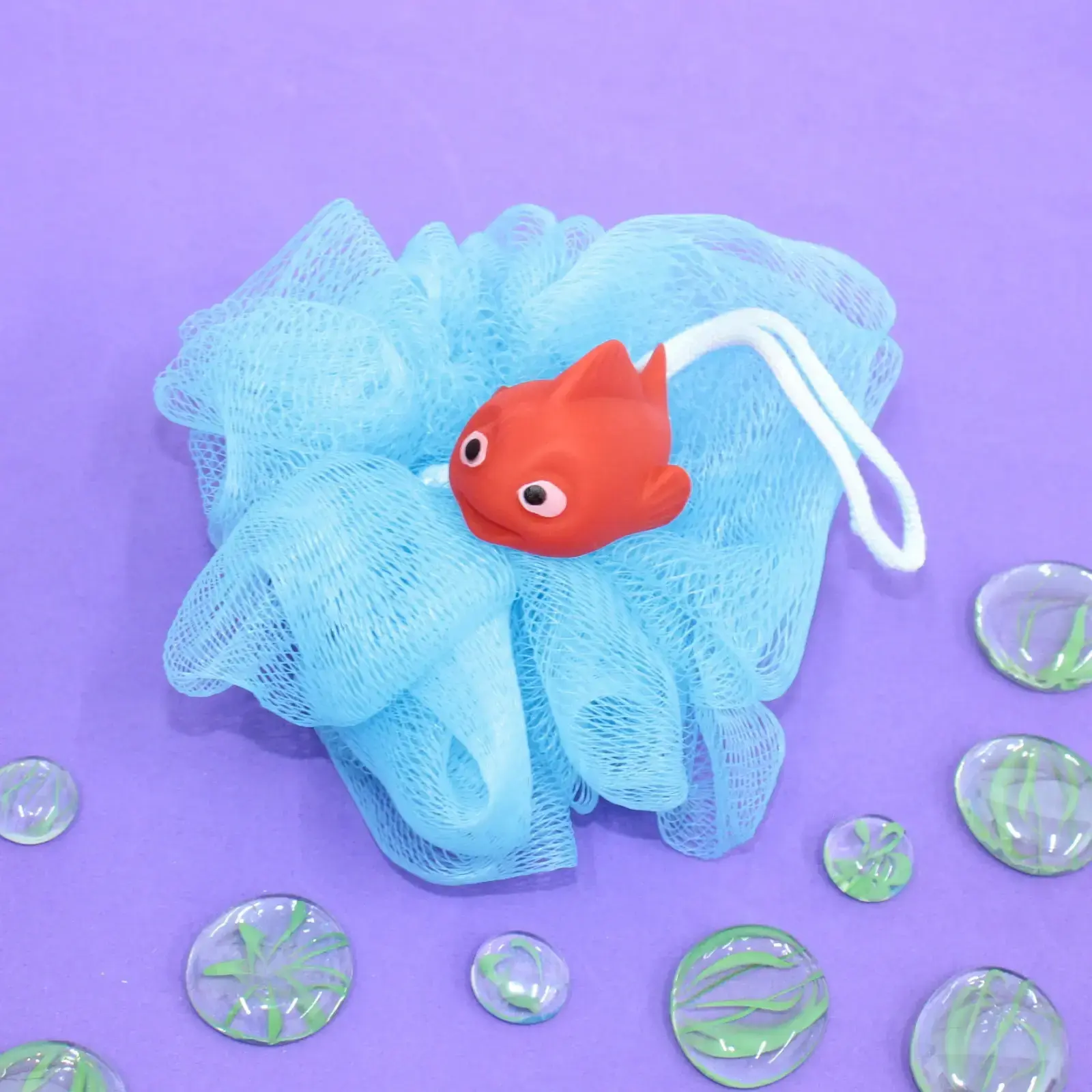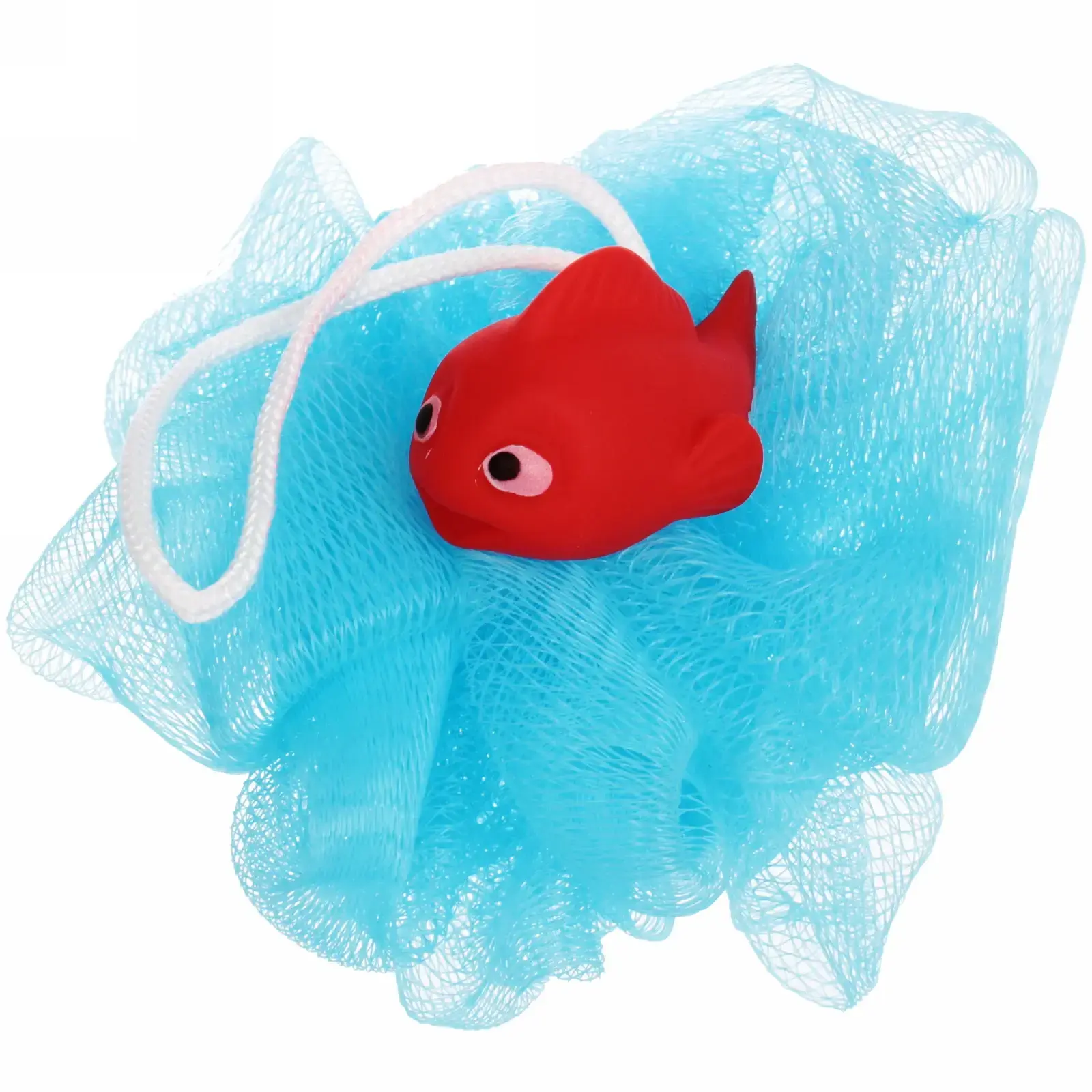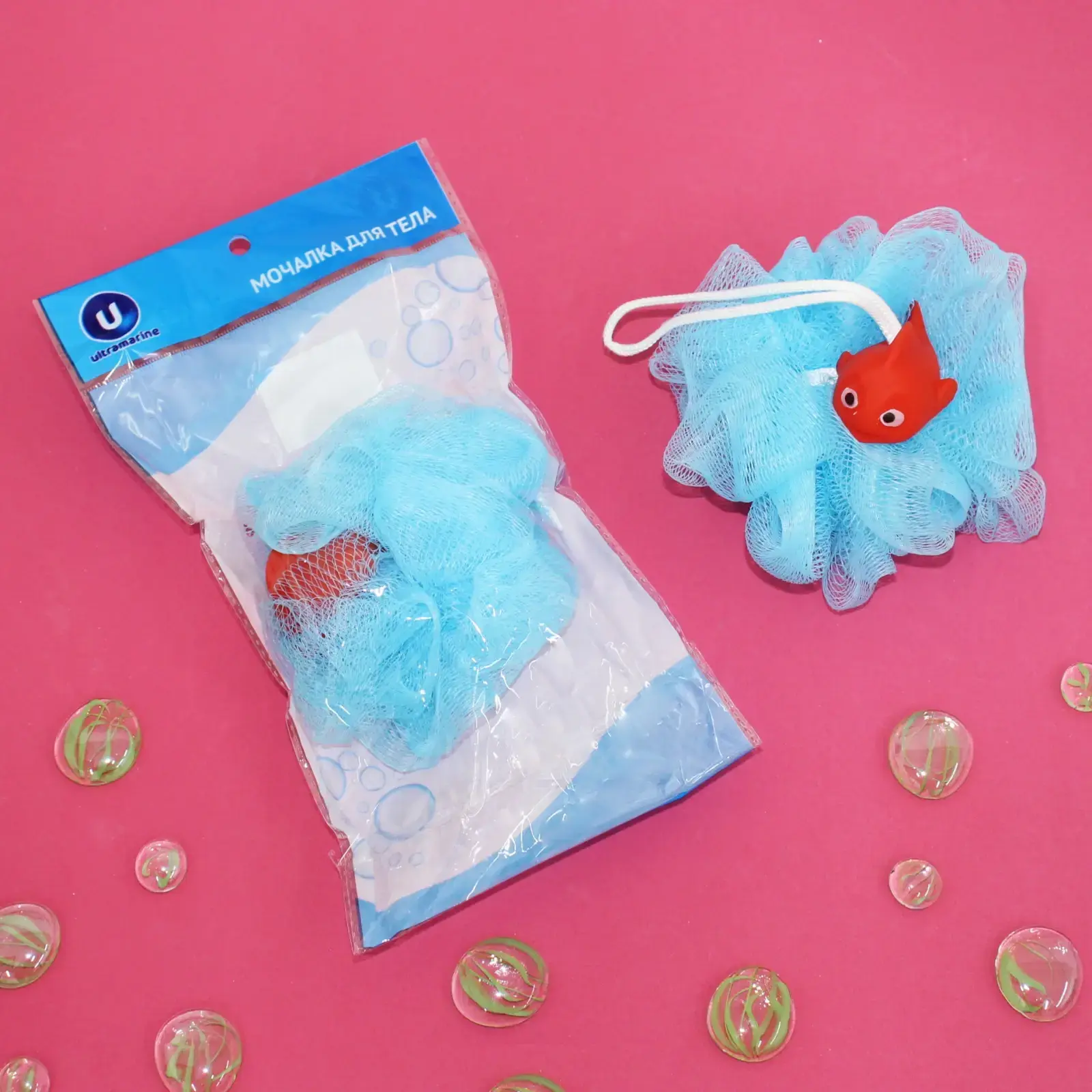 Размер мочалки составляет 11 см в диаметре, а вес — всего 20 граммов, что делает ее легкой и удобной для использования. Яркий голубой цвет и красный элемент в виде рыбки добавляют ей привлекательности и делают ее идеальным подарком для маленьких любителей водных процедур.