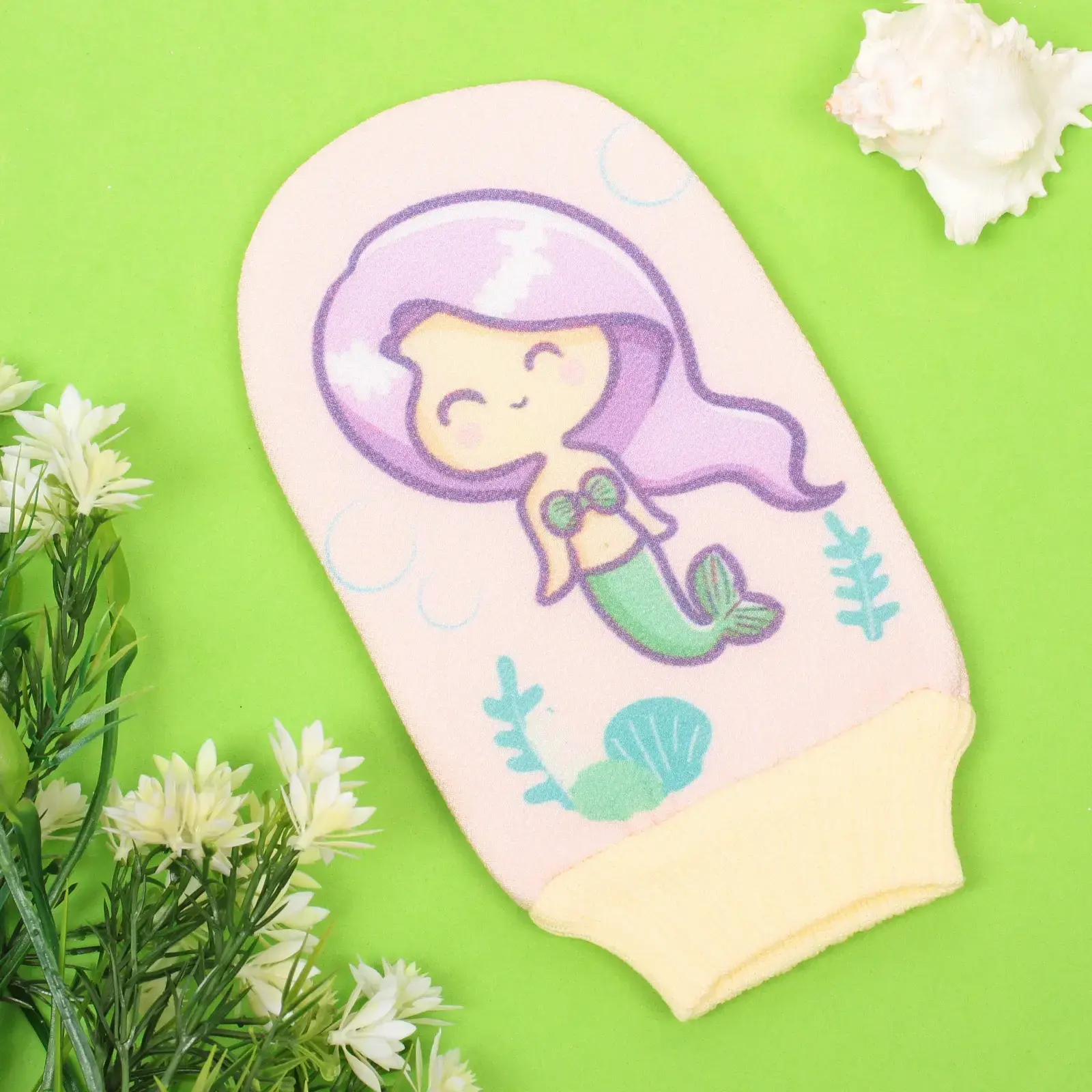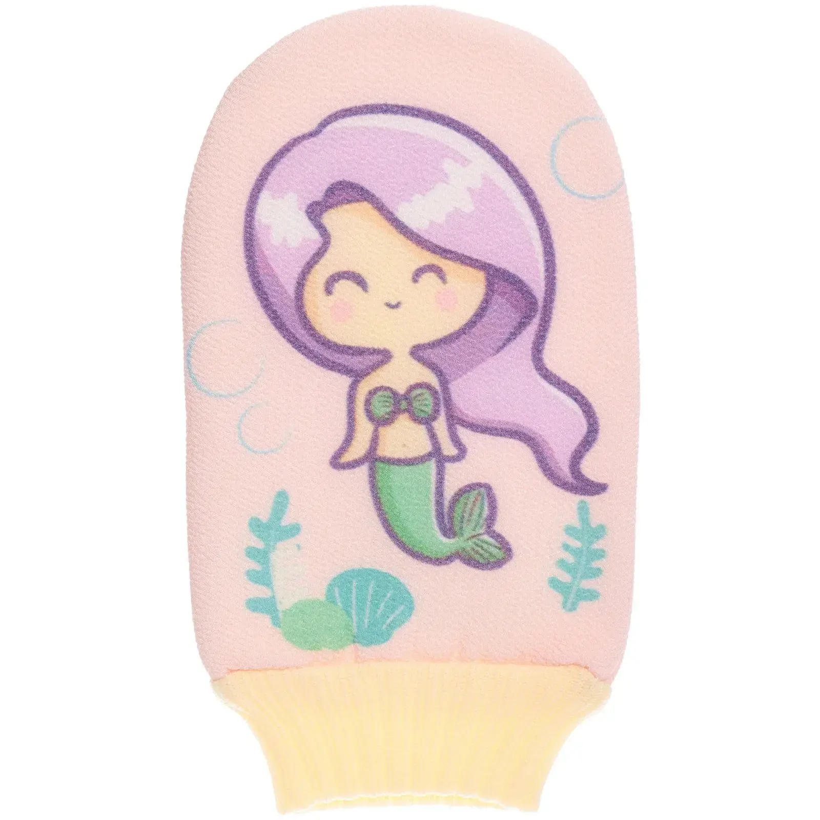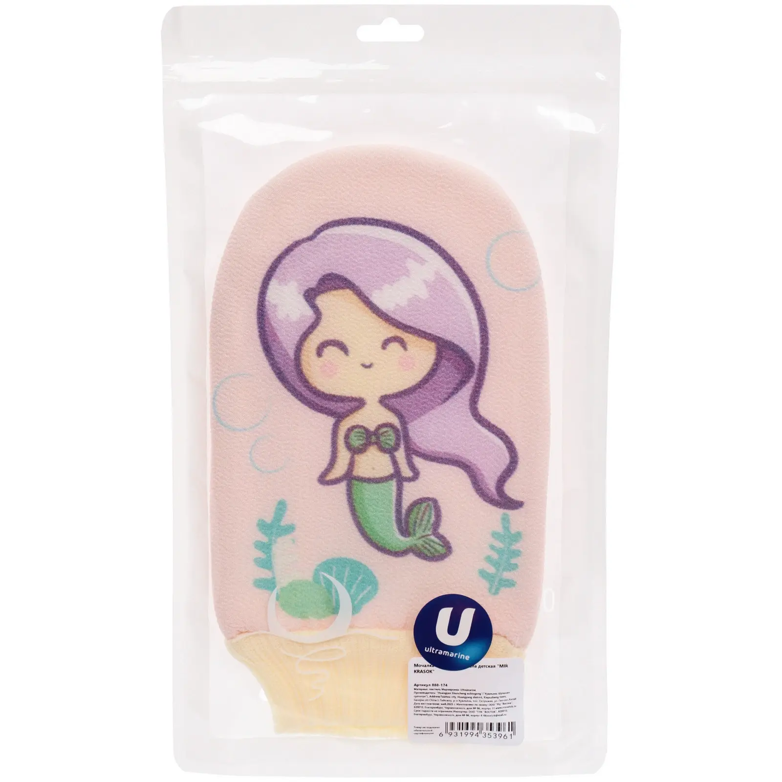 Мочалка-варежка идеально подходит для детей, которые любят играть во время купания. Удобная форма и эластичный манжет желтого цвета обеспечивают надежную фиксацию на руке, позволяя ребенку самостоятельно использовать мочалку. Яркий дизайн с изображением русалки и водорослей привлекает внимание и создает атмосферу морского приключения.