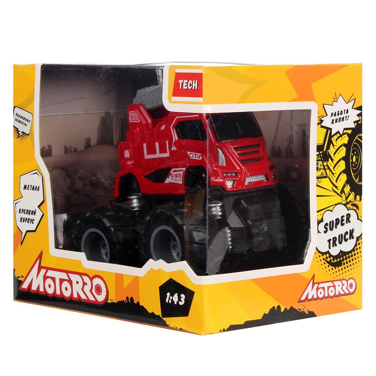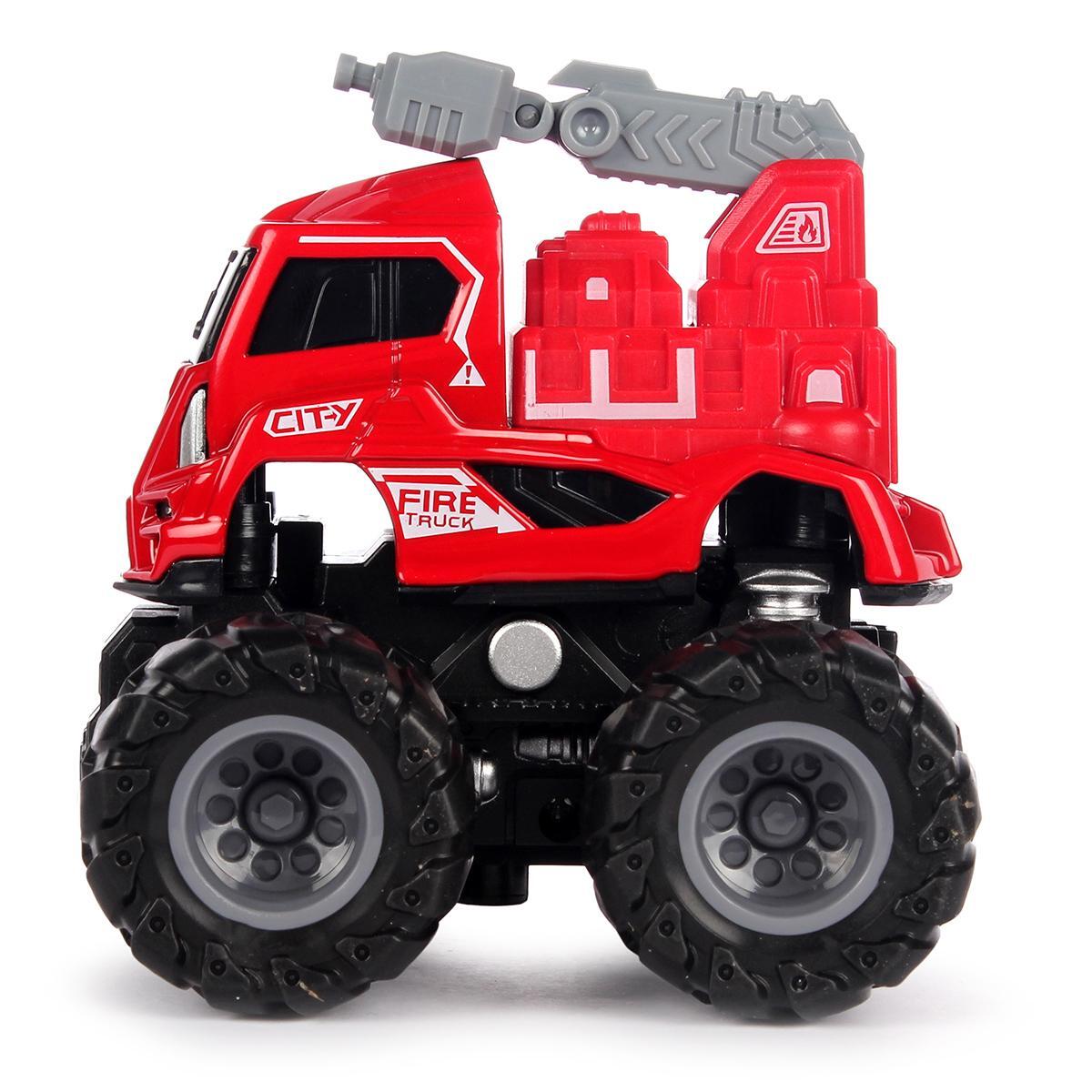 Размеры модели: 11,5х14х10 см. Выполнена в ярком красно-черном цвете с проработанными элементами кузова, такими как лестница, фары и решетка радиатора. Колеса оснащены глубоким протектором, что добавляет реализма при движении по различным поверхностям.
