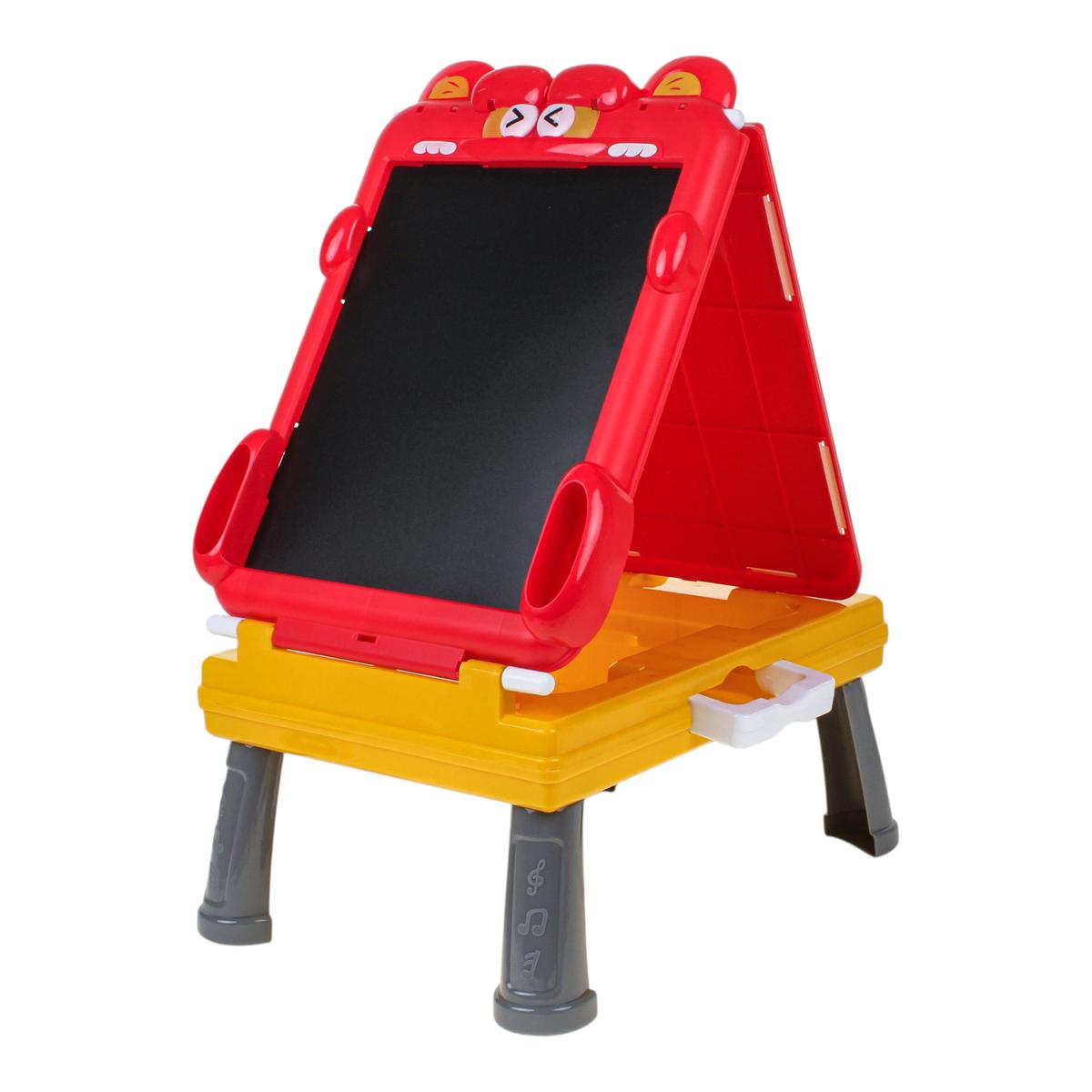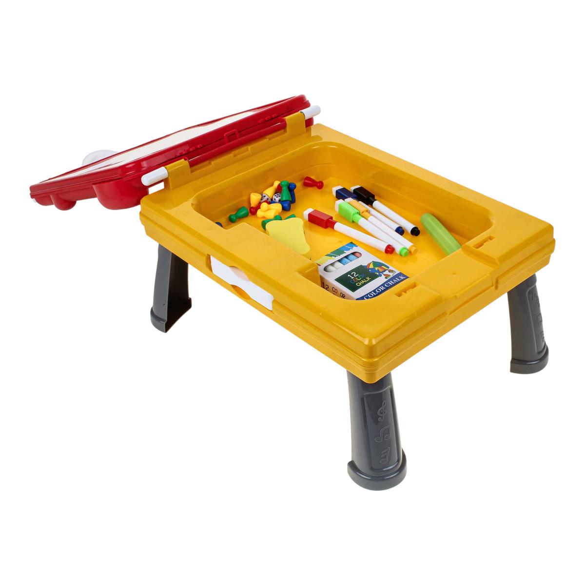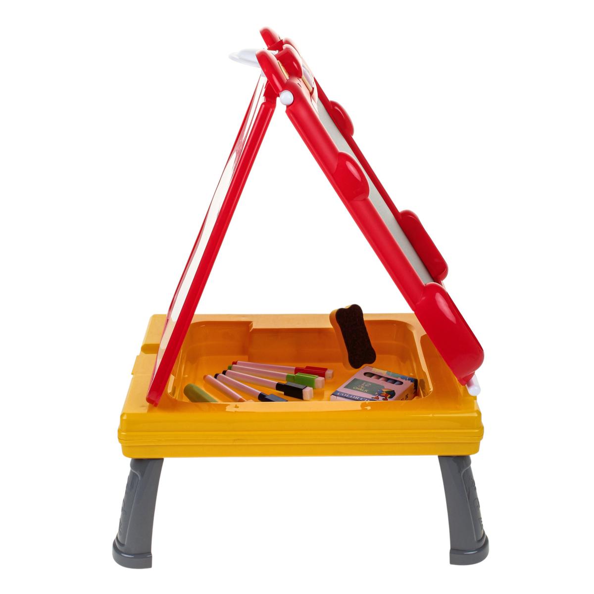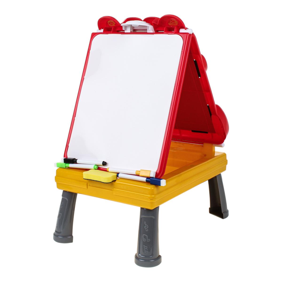 - Встроенный пенал — фломастеры, мелки и губка всегда под рукой, ничего не теряется.