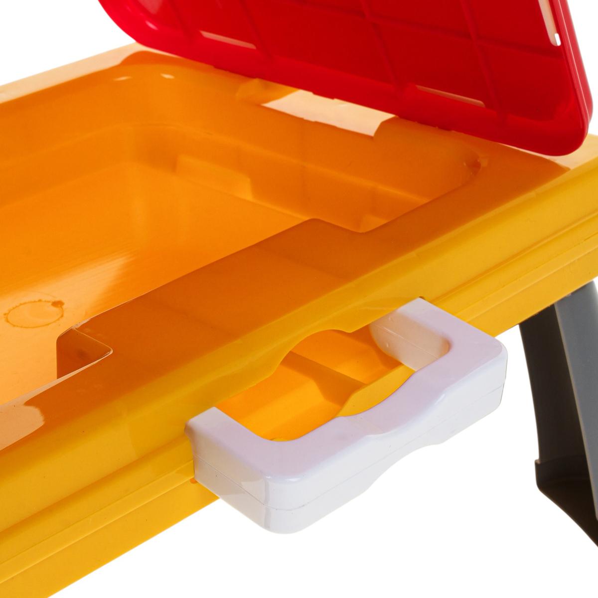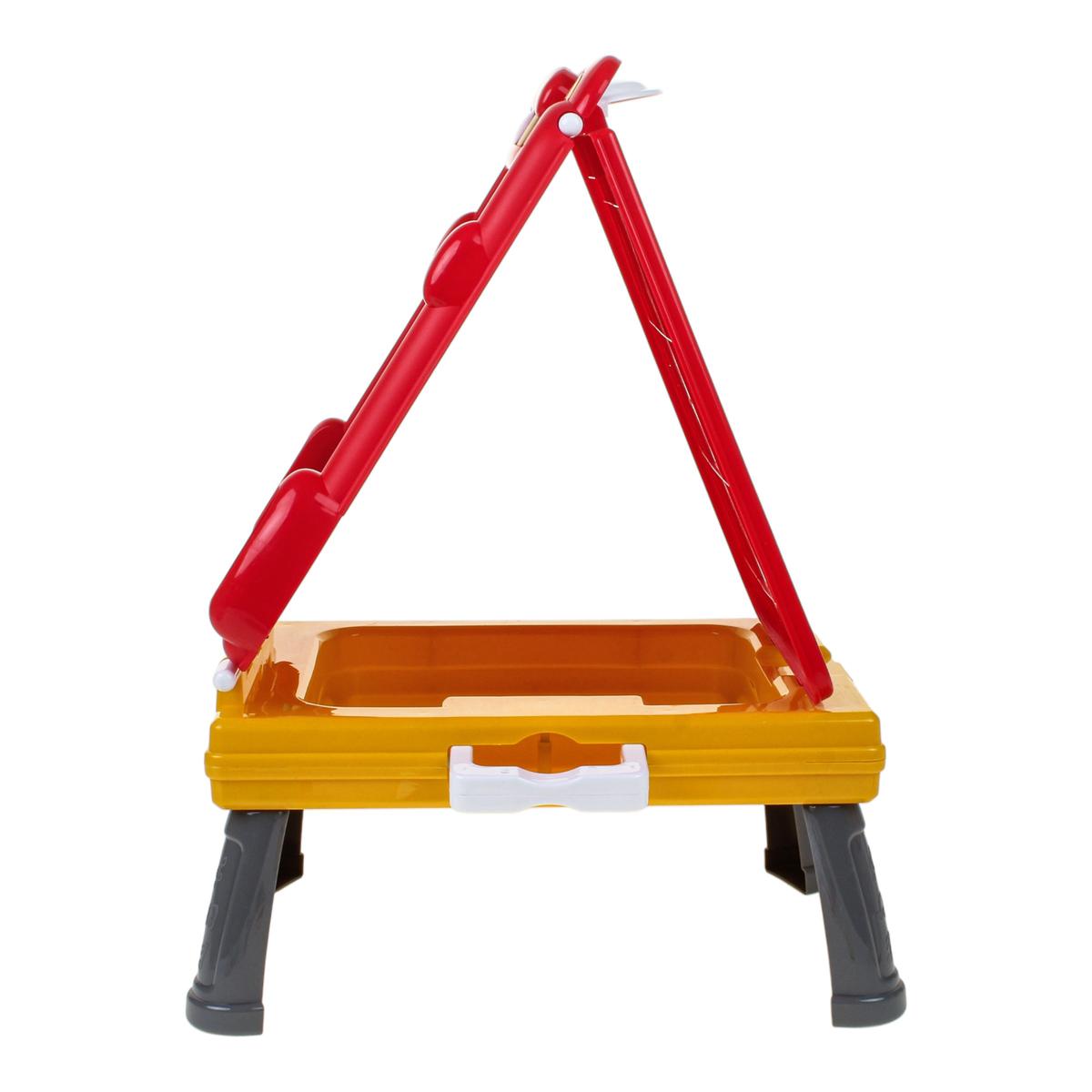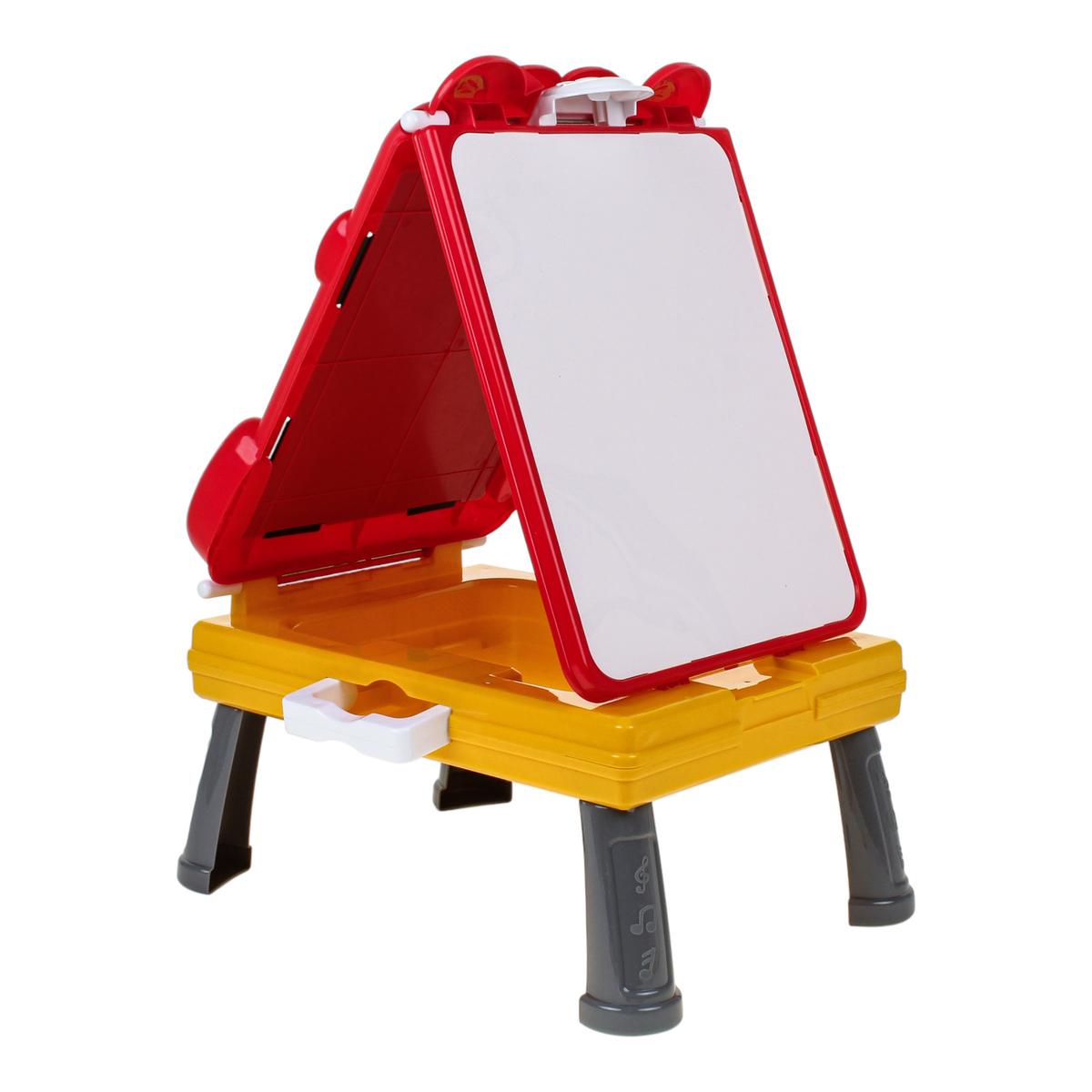 - Встроенный пенал — фломастеры, мелки и губка всегда под рукой, ничего не теряется.