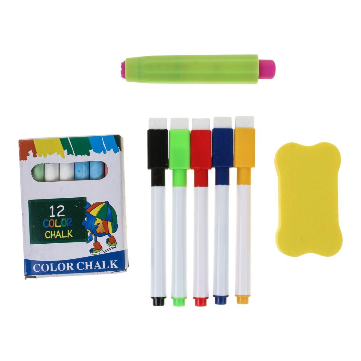 - Комплект готов к работе: 4 фломастера, цветные мелки, губка-ластик и удобный зелёный кейс.