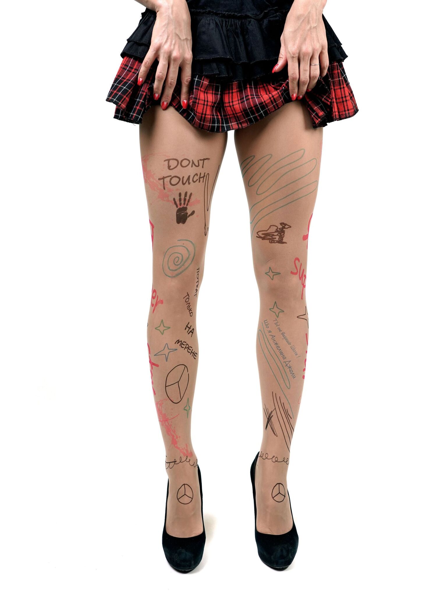 Выбирая эти колготки, вы получаете не только стильный аксессуар, но и высокое качество. Изготовленные из 88% полиамида и 12% эластана, они обеспечивают комфорт и свободу движений. Эти колготки подойдут для любого случая, будь то встреча с друзьями или вечерний выход. Их уникальный дизайн с графическими элементами и надписями, такими как 'DON'T TOUCH' и 'super star', делает их настоящим модным заявлением.