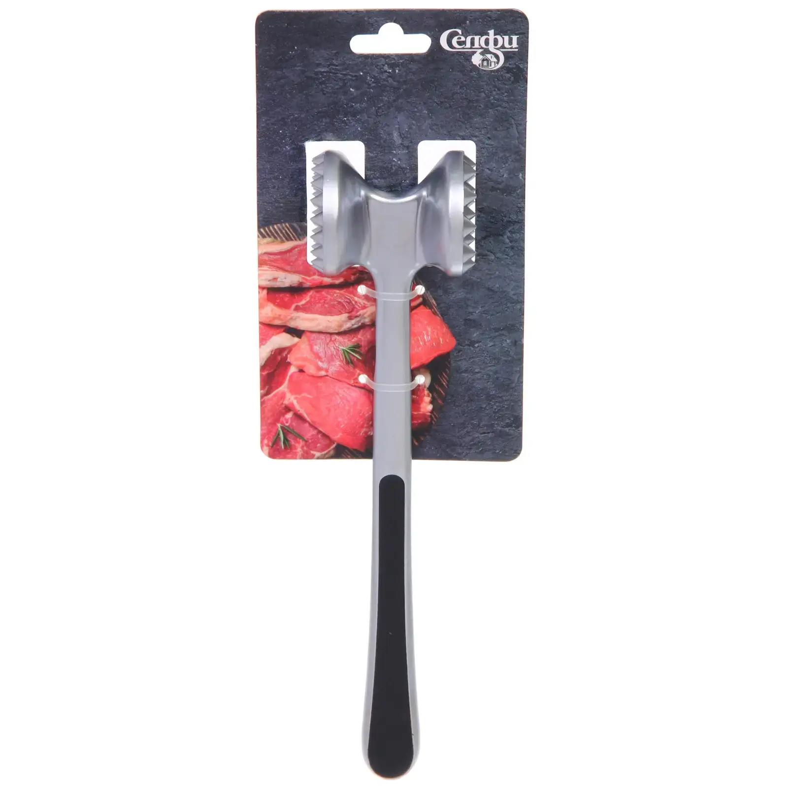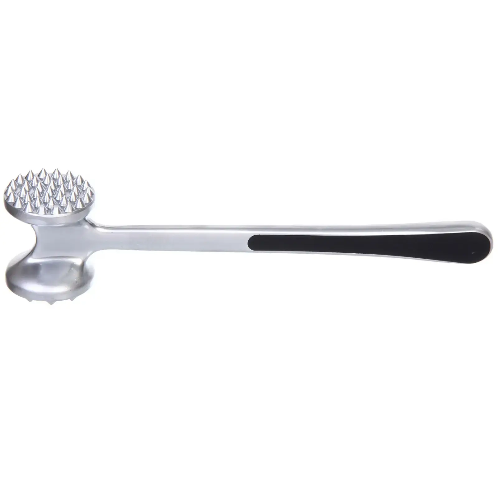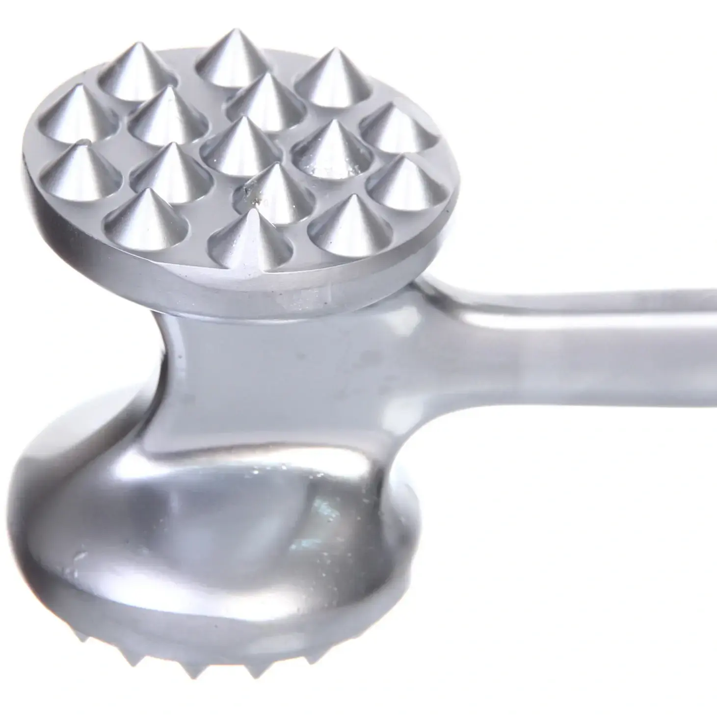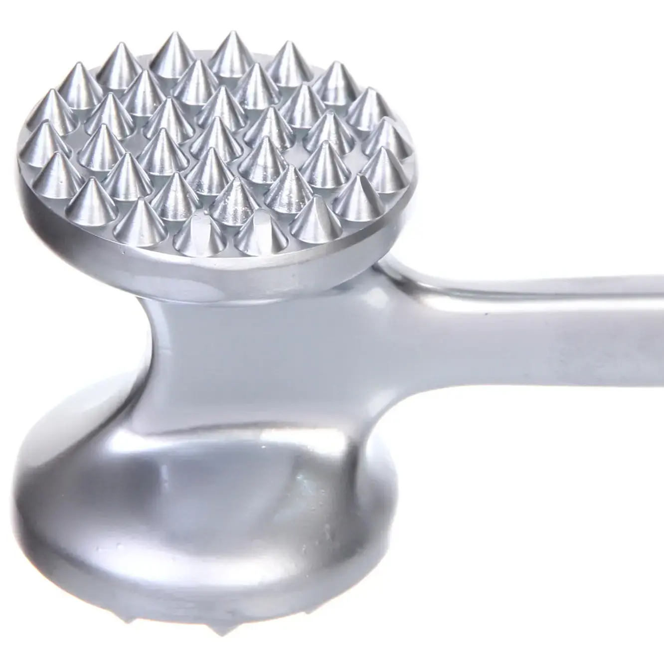 Молоток имеет две рабочие стороны: одна с крупными зубцами для интенсивного размягчения, другая — гладкая для более деликатной обработки. Это делает его универсальным инструментом, подходящим как для профессиональных поваров, так и для домашних кулинаров. Длина ручки составляет 20 см, что обеспечивает удобный захват и легкость в использовании.