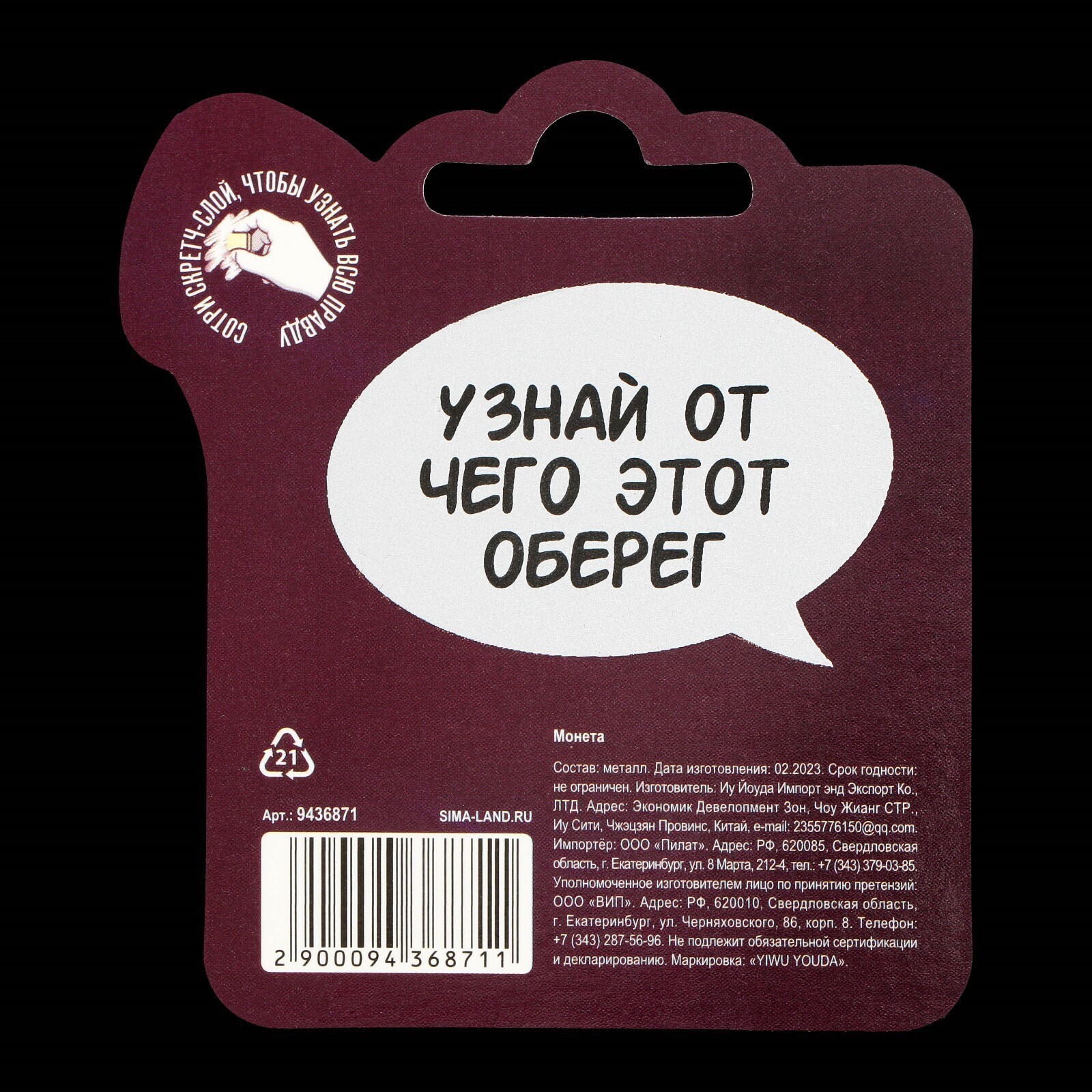 Важно: изделие предназначено для лиц старше 18 лет. Изготовлено из металла с защитным покрытием, не требует специального ухода. Компактные размеры (2,5 см в диаметре) позволяют всегда носить монетку с собой.
