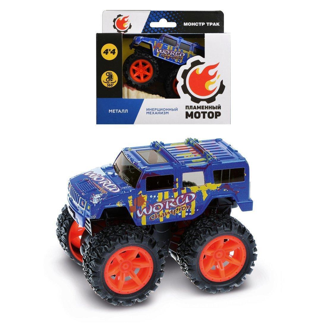 Инерционный монстр трак, металлический корпус, механизм 4x4, вращающиеся задние колеса, синий с оранжевыми дисками