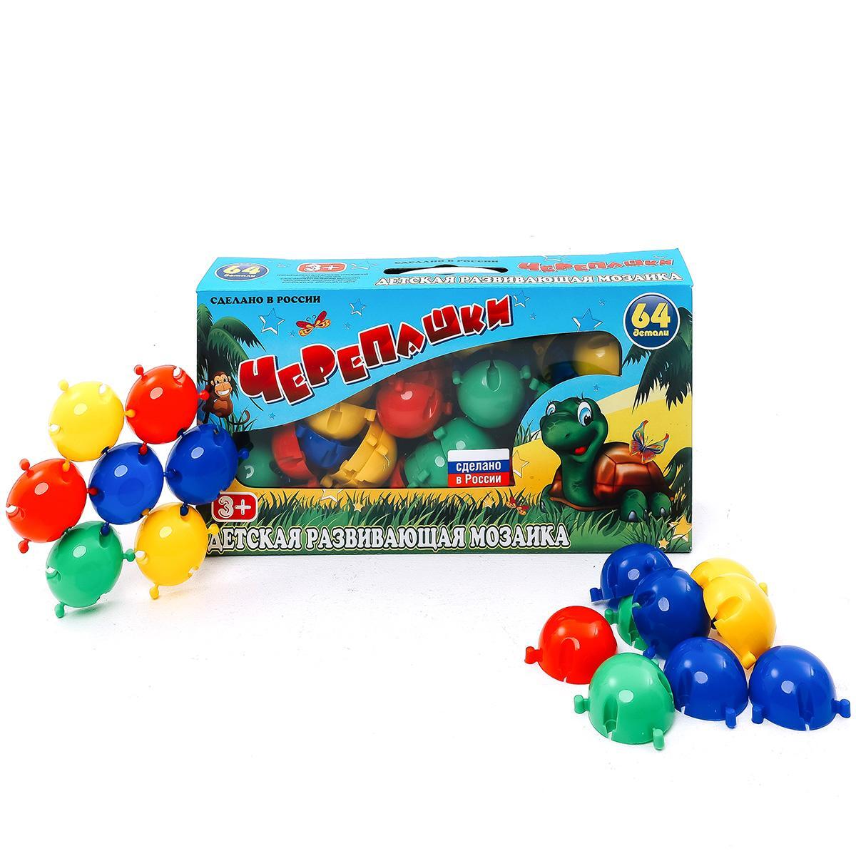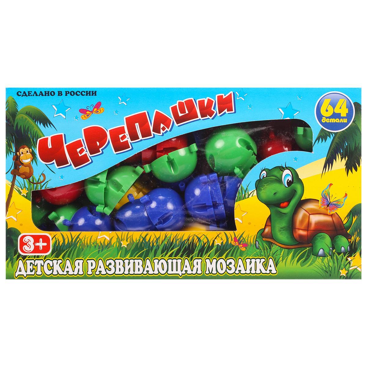 Мозаика 'Черепашки' состоит из 64 элементов различных цветов: красного, зеленого, синего и желтого. Она предназначена для детей старше 3 лет, что делает ее идеальной для раннего развития. Ребенок сможет создавать различные фигуры, развивая свою фантазию и творческие способности.