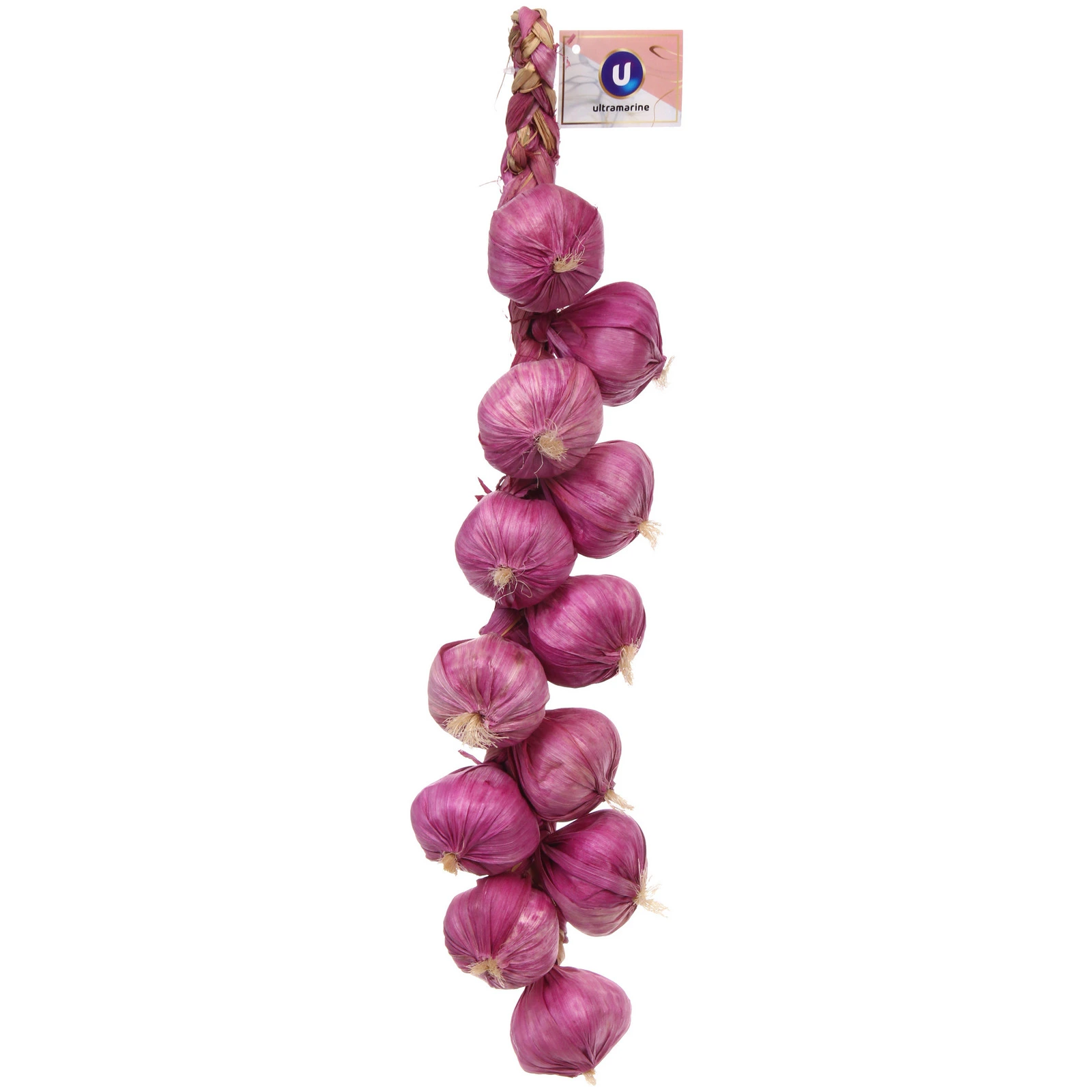 Муляж чеснока имеет общую длину около 40 см. Головки выполнены в насыщенном фиолетово-розовом цвете с естественными светлыми и тёмными полосками. Основа-косичка имеет бежево-коричневый оттенок. Изделие является декоративным и не предназначено для употребления в пищу.