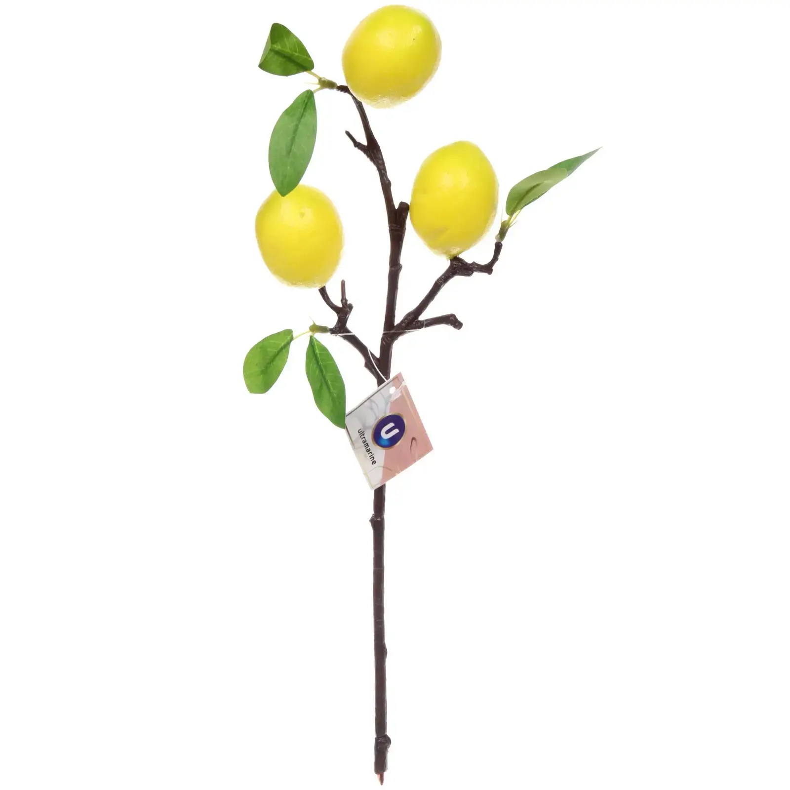 Размер ветки составляет 40 см, что делает её удобной для размещения на столах, полках или в качестве акцента в интерьере. Лимоны имеют средний размер, примерно с мяч для тенниса, что добавляет реалистичности. Коричневая ветка имитирует натуральные древесные стебли, а зелёные листья придают изделию естественный вид.