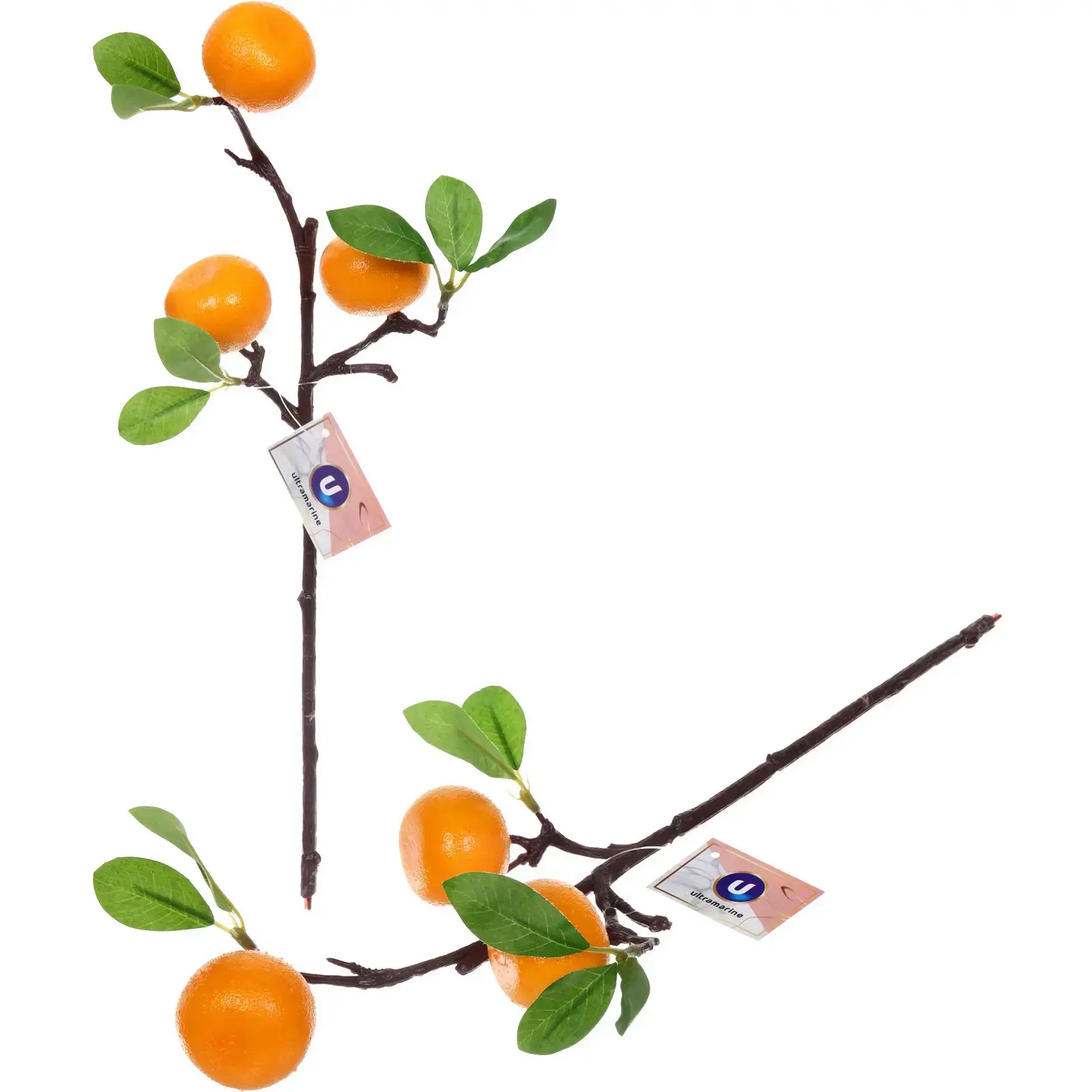 Размер ветки составляет 40 см, что делает её удобной для размещения в различных местах. Мандарины имеют гладкую поверхность и яркий оранжевый цвет, а листья выполнены в естественном зеленом оттенке, что придаёт композиции натуральный вид. Ствол ветки коричневого цвета имитирует древесину, добавляя реалистичности.