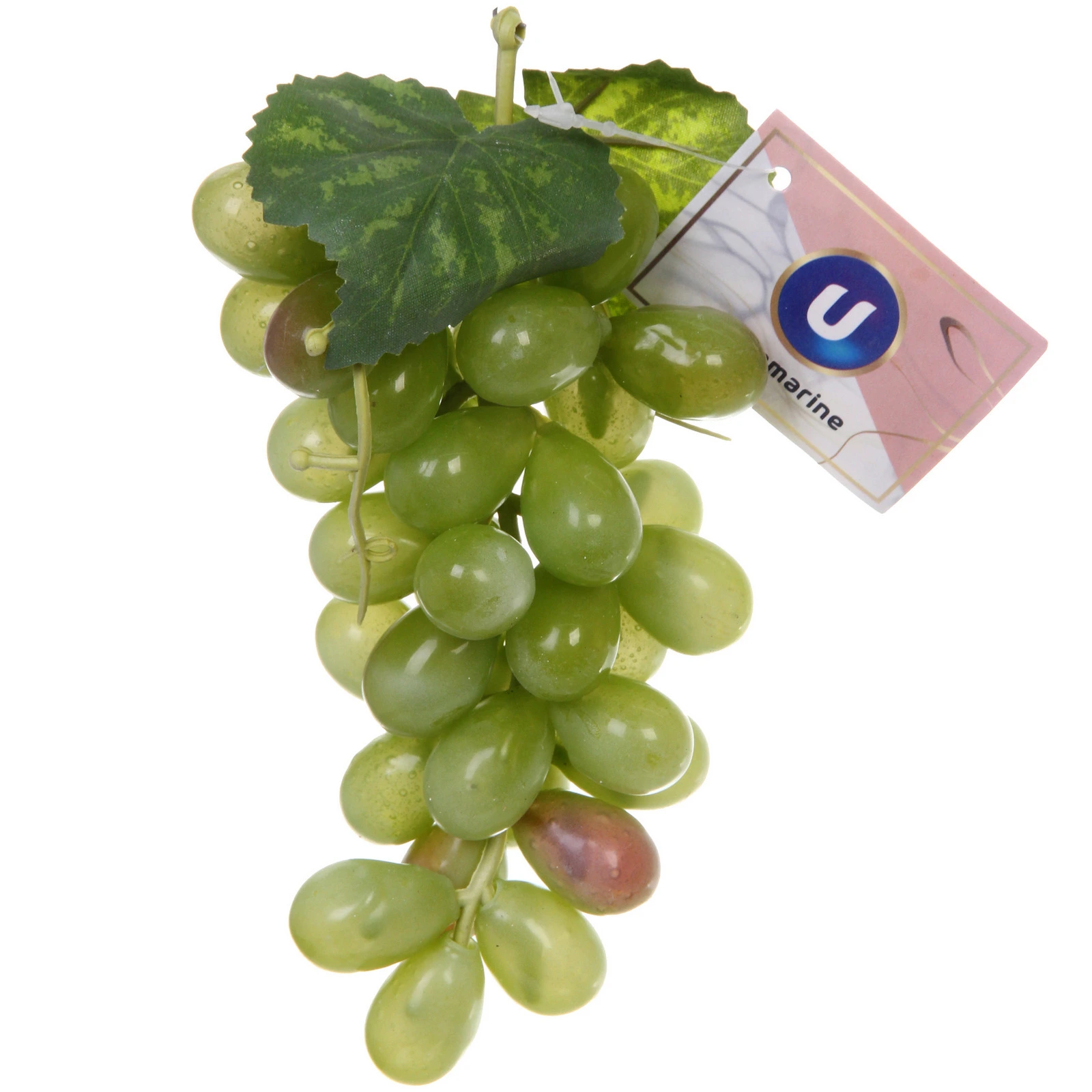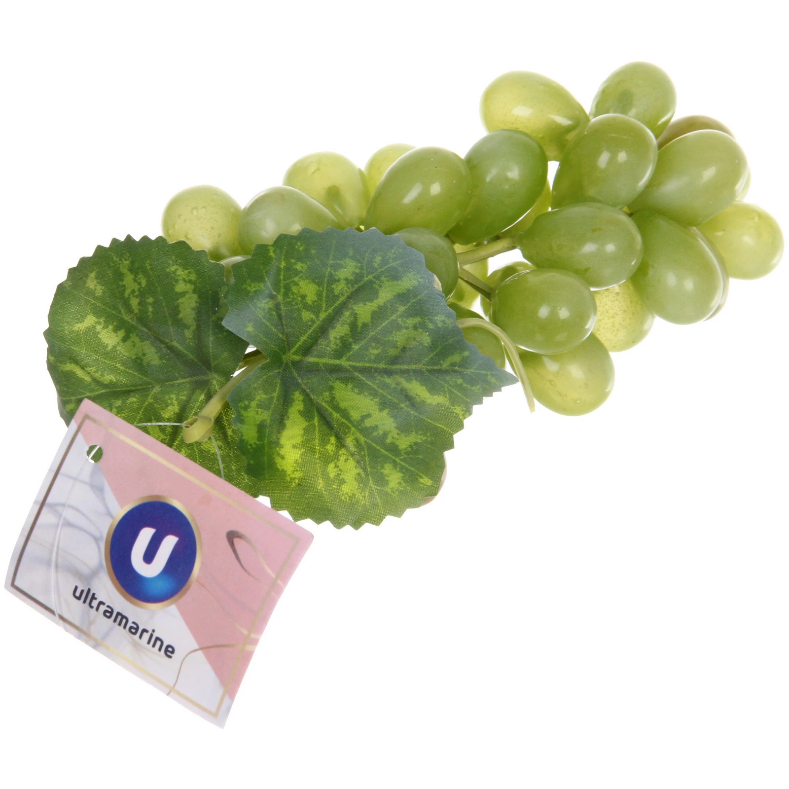 Муляж представляет собой гроздь винограда высотой примерно 16 см. В композицию входят искусственные ягоды, стебель и декоративные листья. Цвет — различные оттенки зеленого с естественными переходами. Изделие поставляется с фирменной биркой. Это стильный и не требующий хлопот способ оживить пространство вокруг себя.