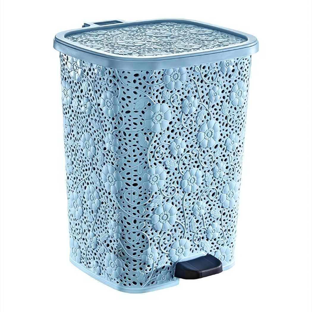 Мусорное ведро с педальным механизмом сочетает практичность и стильный дизайн. Ажурный рельефный узор и нежный голубой цвет превращают обычный аксессуар в элемент декора, который органично впишется в интерьер кухни или ванной комнаты.