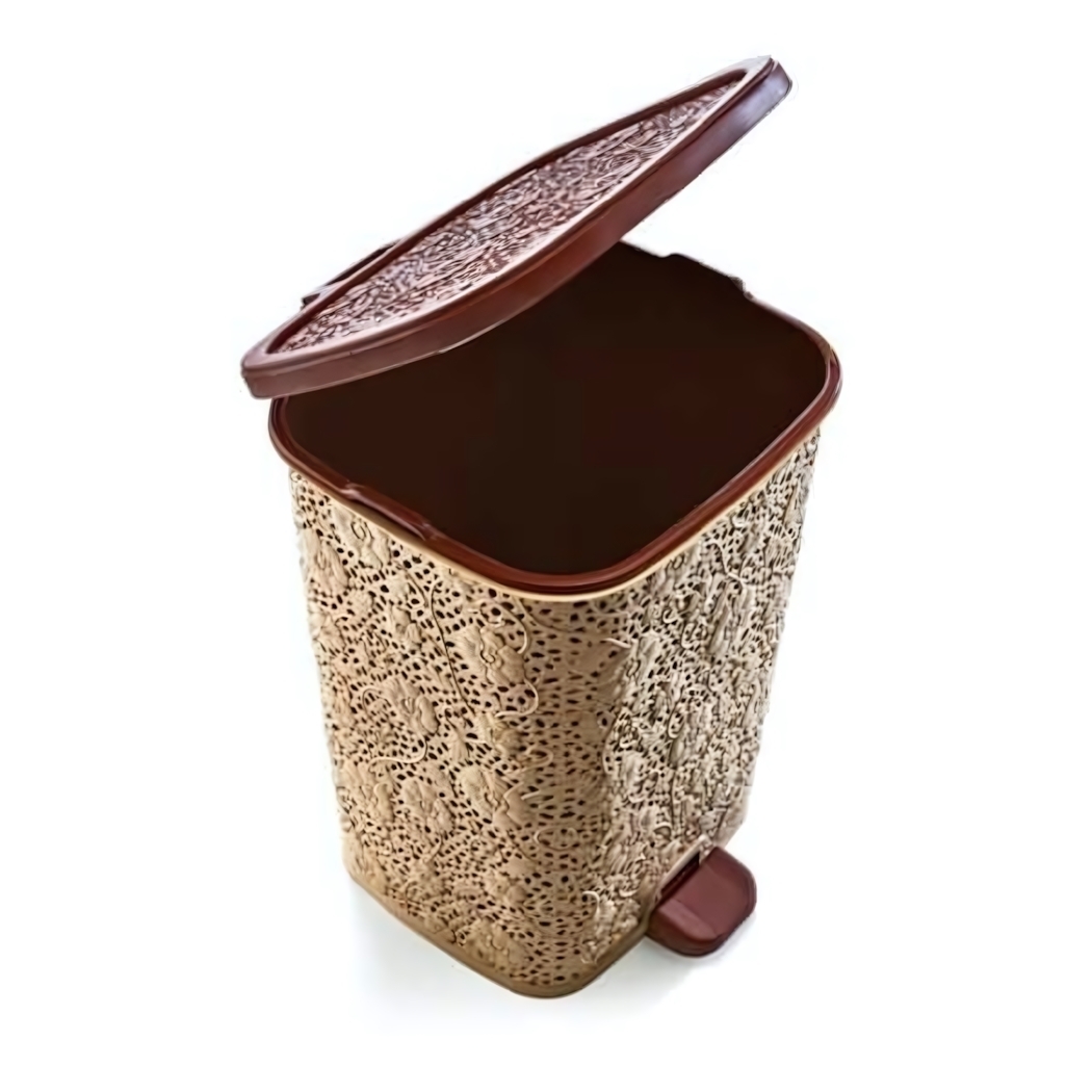 Практичное ведро с педальным механизмом сочетает функциональность и эстетику — идеальный помощник для кухни, ванной или офиса. Ажурный узор на бежевом корпусе превращает обычный аксессуар в стильный элемент интерьера.