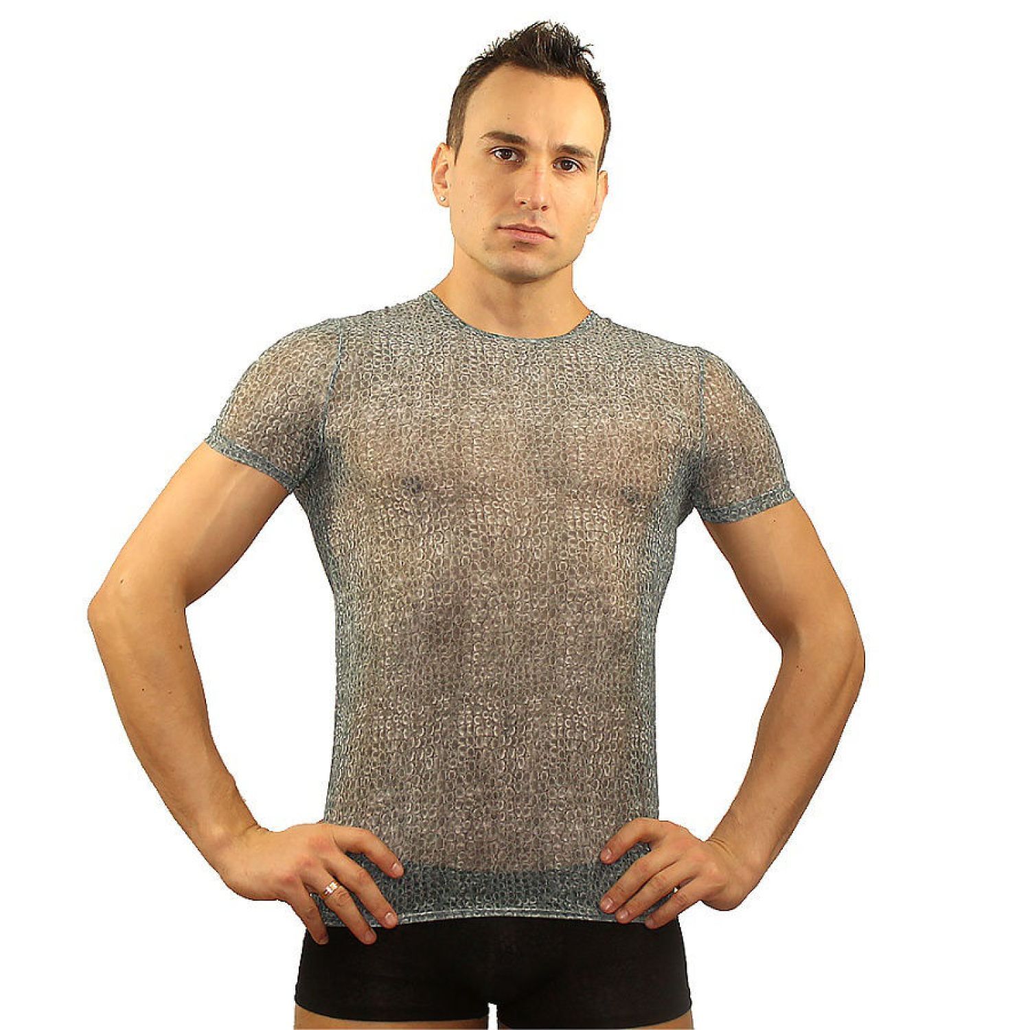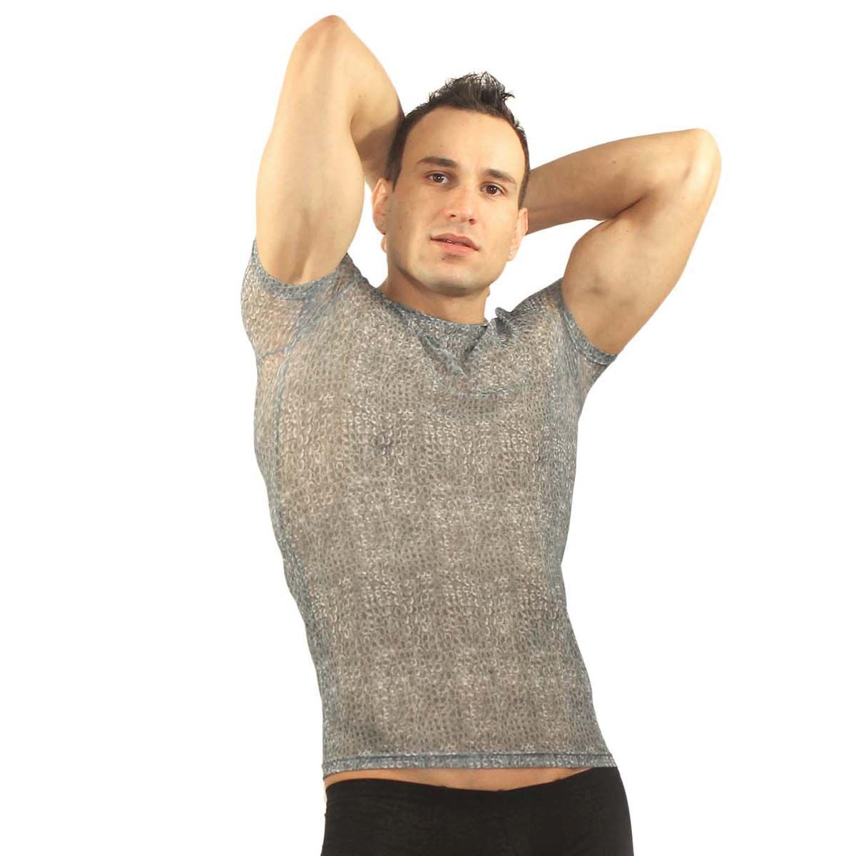 Выбирая эту футболку, вы получаете не только стильный элемент одежды, но и практичность. Материал, состоящий на 90% из полиэстера и 10% из эластана, обеспечивает отличную растяжимость и долговечность. Сетчатая текстура позволяет коже дышать, что особенно важно в теплую погоду. Серый цвет с перламутровым эффектом придаёт футболке современный вид, а облегающая форма акцентирует внимание на мускулатуре.
