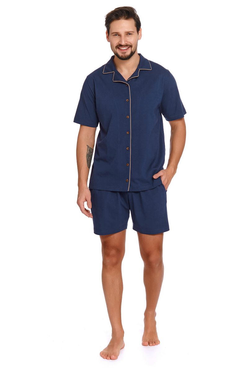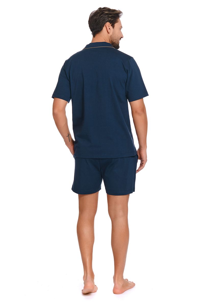 Пижама выполнена из 100% хлопка, что делает ее отличным выбором для ежедневного использования. Натуральная ткань отличается износостойкостью и сохраняет аккуратный вид после стирок. Темно-синий цвет выглядит сдержанно и универсально, а контрастная отделка воротника и планки придает комплекту выразительность.