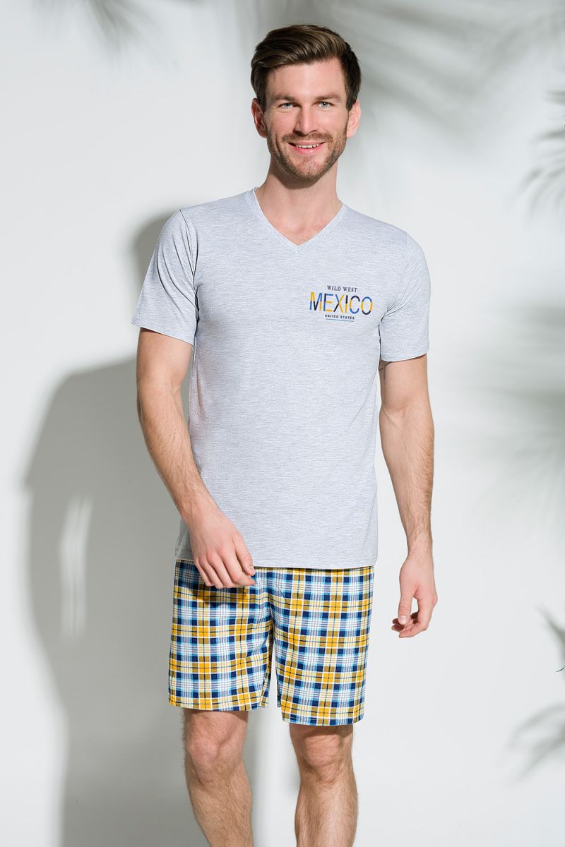 Модель состоит из футболки с коротким рукавом и шорт в клетку. Футболка серого оттенка дополнена V-образным вырезом и стильным принтом с надписью «MEXICO», что придаёт образу современный характер. Шорты прямого кроя комфортно сидят и подходят как для сна, так и для домашнего отдыха.