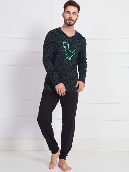 Мужская пижама Vienetta создана для тех, кто ценит мягкость натуральной ткани и удобную посадку. Благодаря 100% хлопку комплект приятно ощущается на коже, позволяет телу дышать и обеспечивает комфорт в любое время года. Черный цвет и стильный принт с динозавром добавляют образу индивидуальности, сохраняя при этом сдержанный и аккуратный внешний вид.