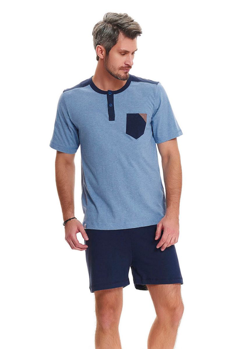 Модель состоит из футболки и шорт — оптимальный вариант для сна и отдыха в теплое время года или в отапливаемом помещении. Футболка выполнена с коротким рукавом и круглым вырезом с планкой на пуговицах, что добавляет аккуратности и делает образ более стильным. Накладной карман на груди подчеркивает дизайн и добавляет практичности.