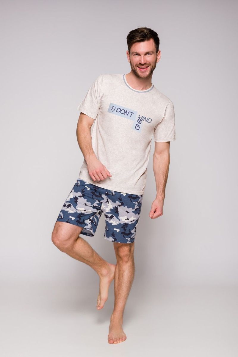 Модель состоит из футболки с коротким рукавом и шорт с камуфляжным принтом. Футболка выполнена в светлом оттенке и дополнена аккуратным круглым вырезом, а шорты длиной до середины бедра обеспечивают удобную посадку и не сковывают движения. Пижама отлично подходит для сна, отдыха дома, утреннего кофе или спокойного вечера после рабочего дня.