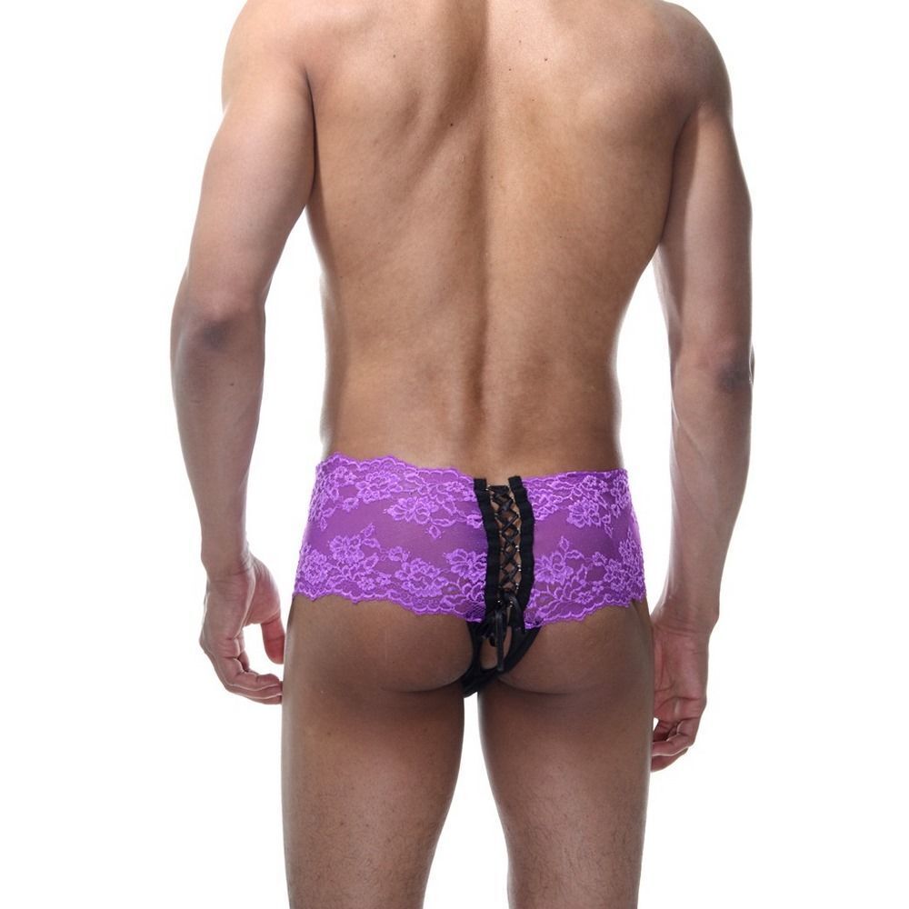 Эти трусы с высокой посадкой подходят для мужчин, которые ценят как стиль, так и комфорт. Они идеально подходят для повседневного ношения или особых случаев, когда вы хотите произвести впечатление. Широкий пояс из фиолетового кружева добавляет нотку элегантности, а черная шнуровка сзади придает изделию особую пикантность.