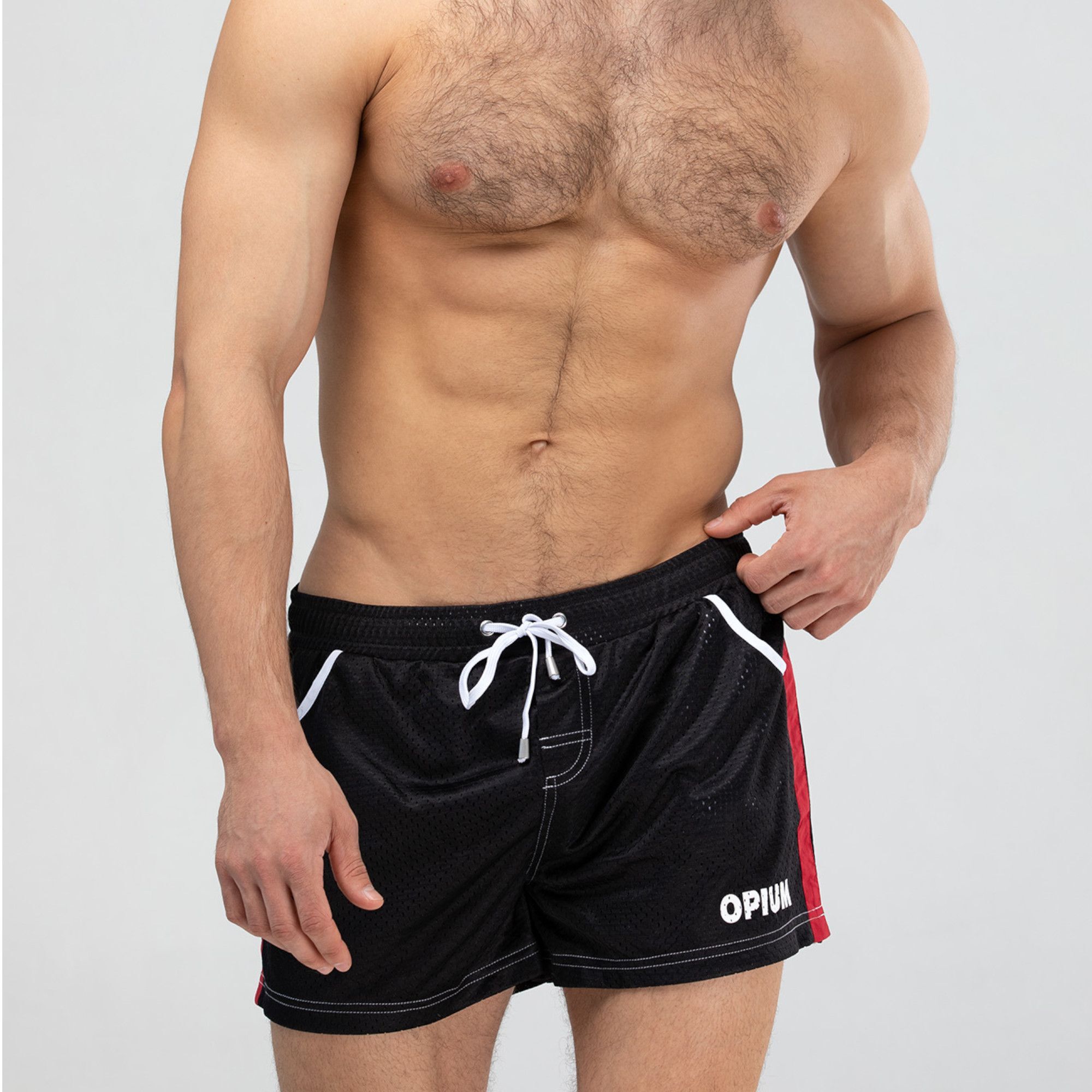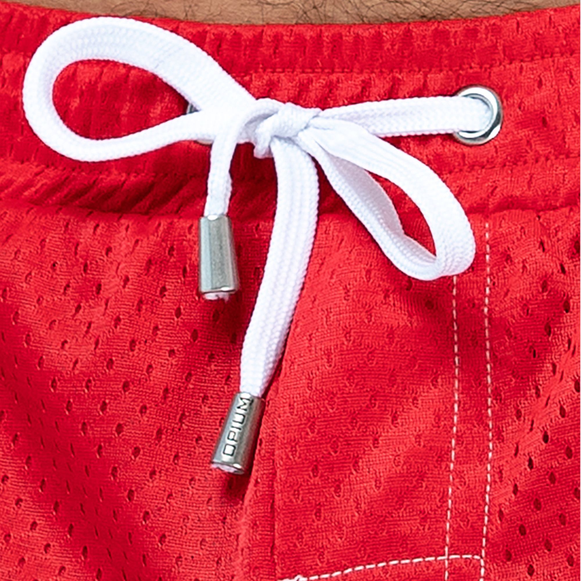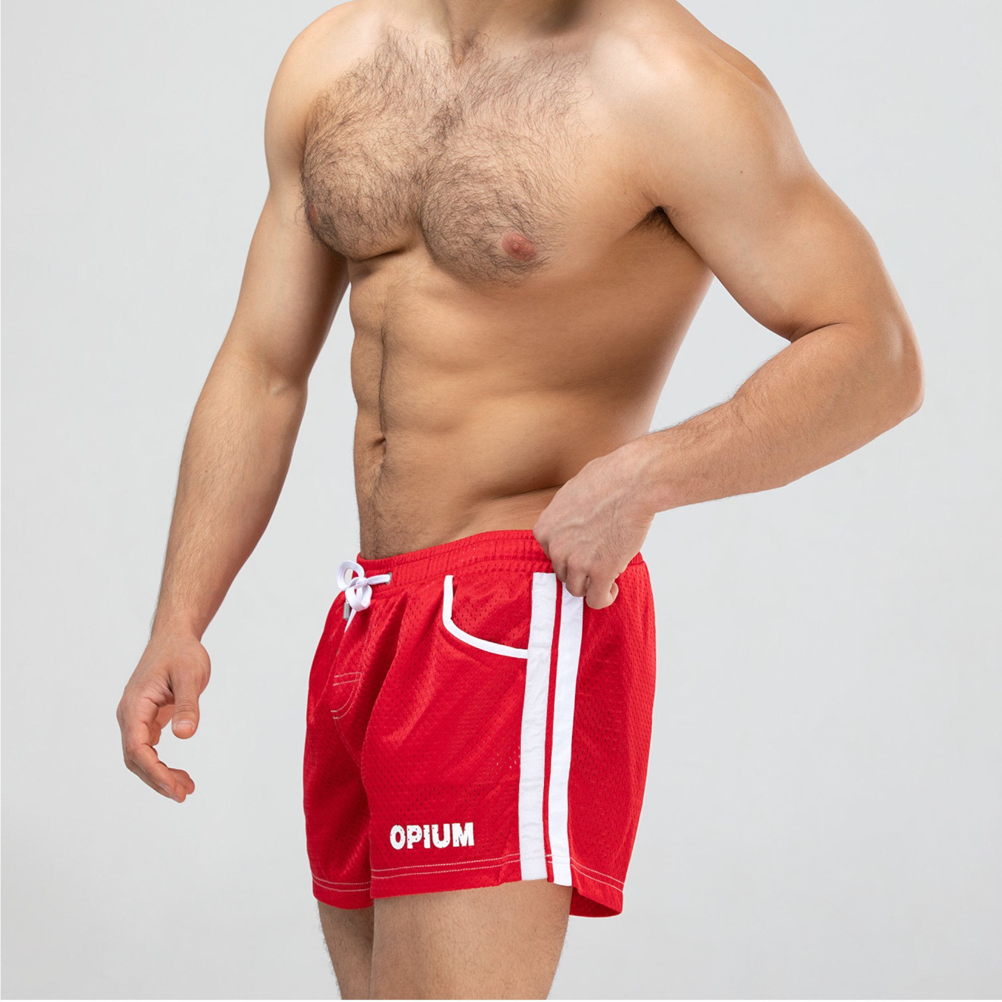 Мужские короткие шорты из быстросохнущего перфорированного материала — это идеальный выбор для активного отдыха и занятий спортом. Эти шорты обеспечивают максимальный комфорт благодаря легкому и дышащему материалу, который быстро сохнет и позволяет коже дышать. Яркий красный цвет с контрастными лампасами добавляет стильный акцент, а регулируемый пояс с шнурком обеспечивает идеальную посадку.