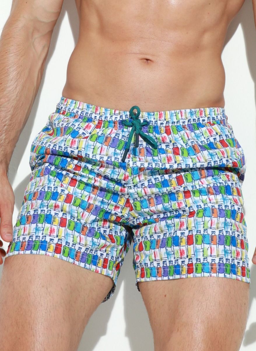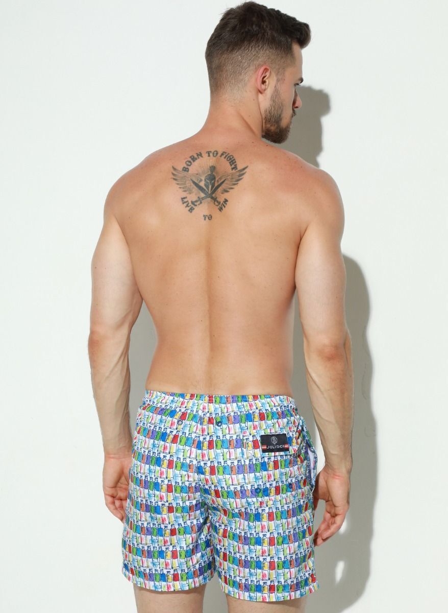 Представляем стильные мужские пляжные шорты 'Jolidon' с уникальным принтом в виде разноцветных бутылочек. Идеальный выбор для тех, кто ценит яркий дизайн и практичность.