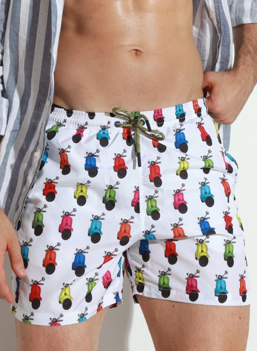 Представляем пляжные шорты с эксклюзивным принтом в виде разноцветных мопедов. Эти шорты не только добавят игривости вашему образу, но и обеспечат комфорт на пляже или у бассейна.