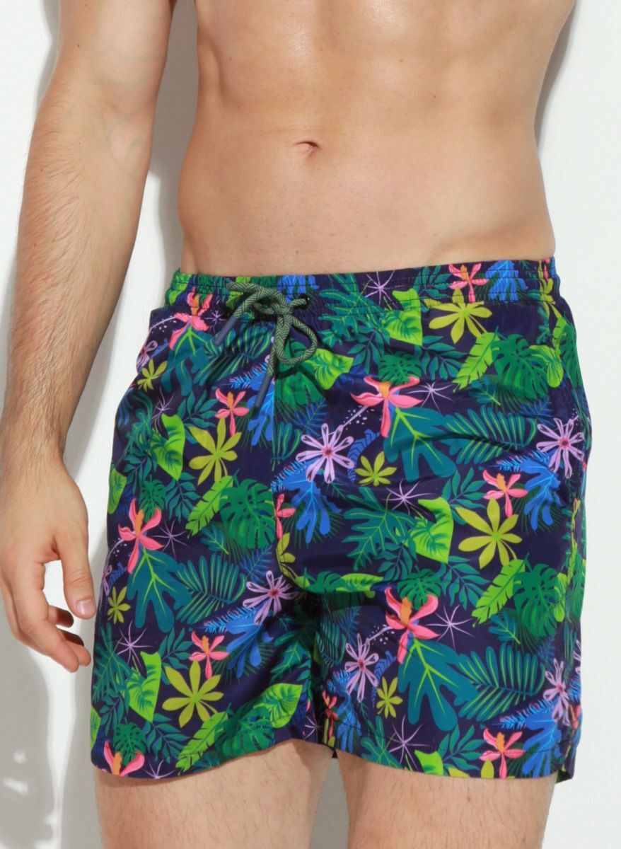 Шорты оснащены боковым карманом на кнопке для безопасного хранения мелких предметов. Яркий тропический принт с цветочными мотивами на темно-синем фоне делает эту модель стильным акцентом пляжного образа.