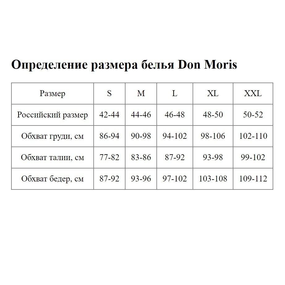 Произведено в Турции с соблюдением международных стандартов качества. Точное соответствие размерной сетке бренда Don Moris гарантирует комфортную посадку — перед покупкой сверьтесь с таблицей обхватов груди, талии и бёдер.