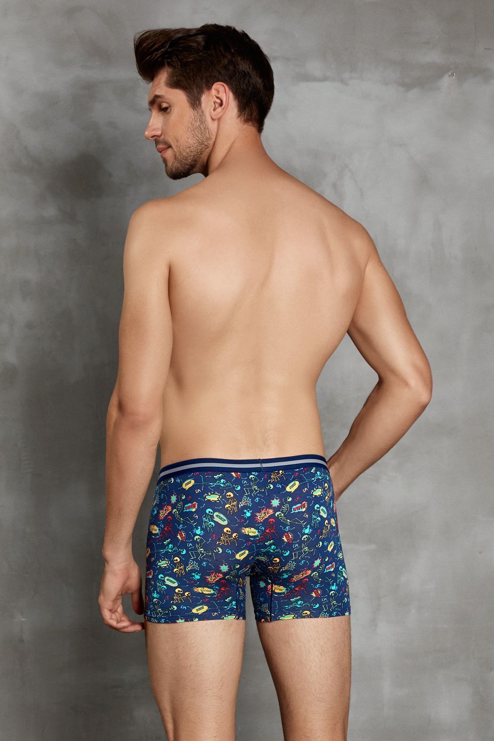 Модель рекомендована для ежедневной носки мужчинам, предпочитающим спортивный крой без ограничения движений. Темно-синий цвет с игривым принтом скелетиков добавляет нотку индивидуальности в базовый гардероб.
