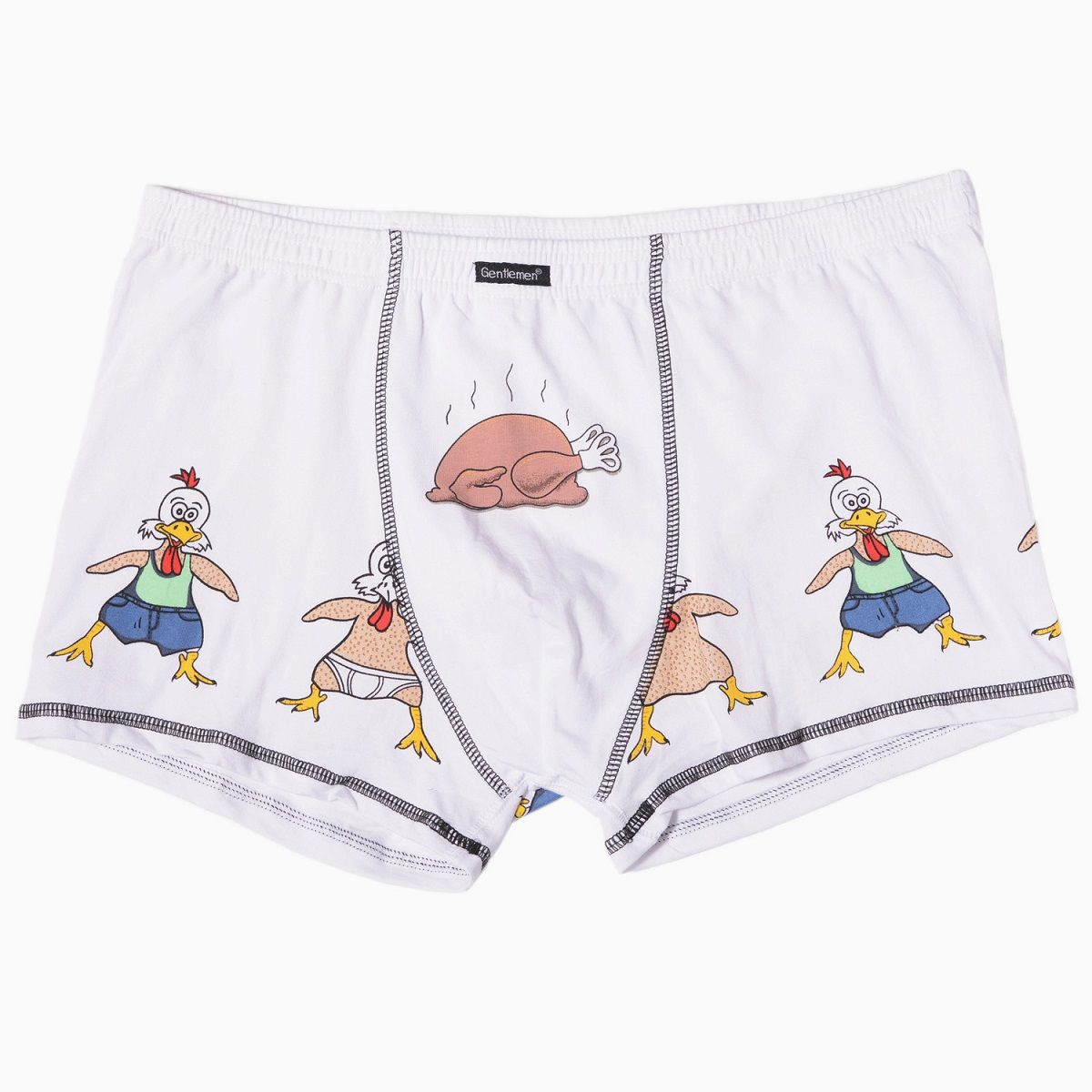 Классический белый цвет модели дополнен уникальным и забавным принтом. На передней панели изображена аппетитная запеченная птица с паром, а на штанинах — харизматичные петухи в человеческой одежде. Использование качественных красителей гарантирует, что разноцветный принт останется ярким и четким на протяжении долгого времени. Анатомический крой и плоские швы делают эти трусы практически неощутимыми под любой одеждой, будь то строгие брюки или спортивные шорты.