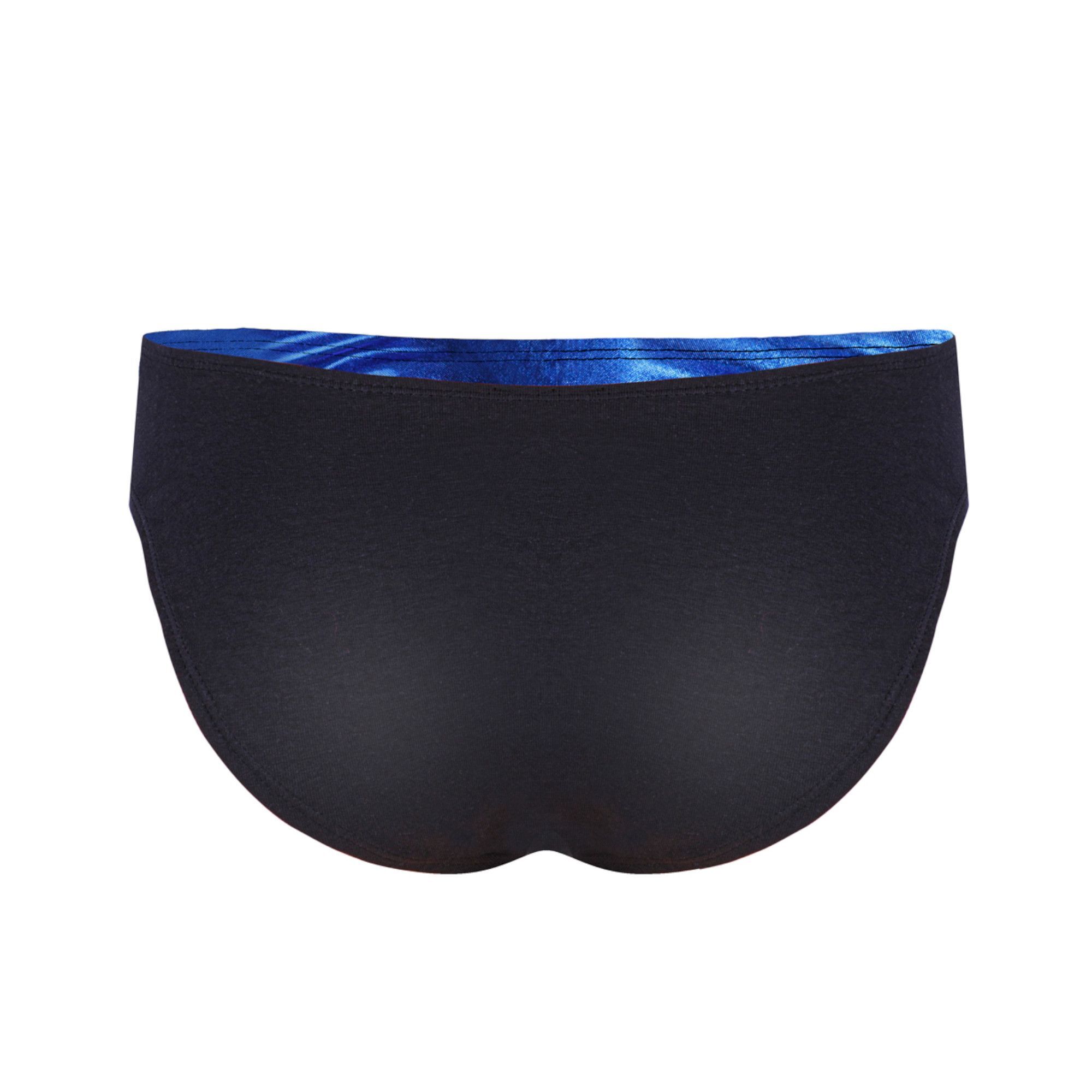 Синяя передняя панель из блестящего материала создает стильный акцент, а черная задняя часть сохраняет нейтральность. Универсальный XL размер подходит для обхвата талии 102-107 см. Состав ткани сохраняет форму после многократных стирок благодаря эластановым волокнам.