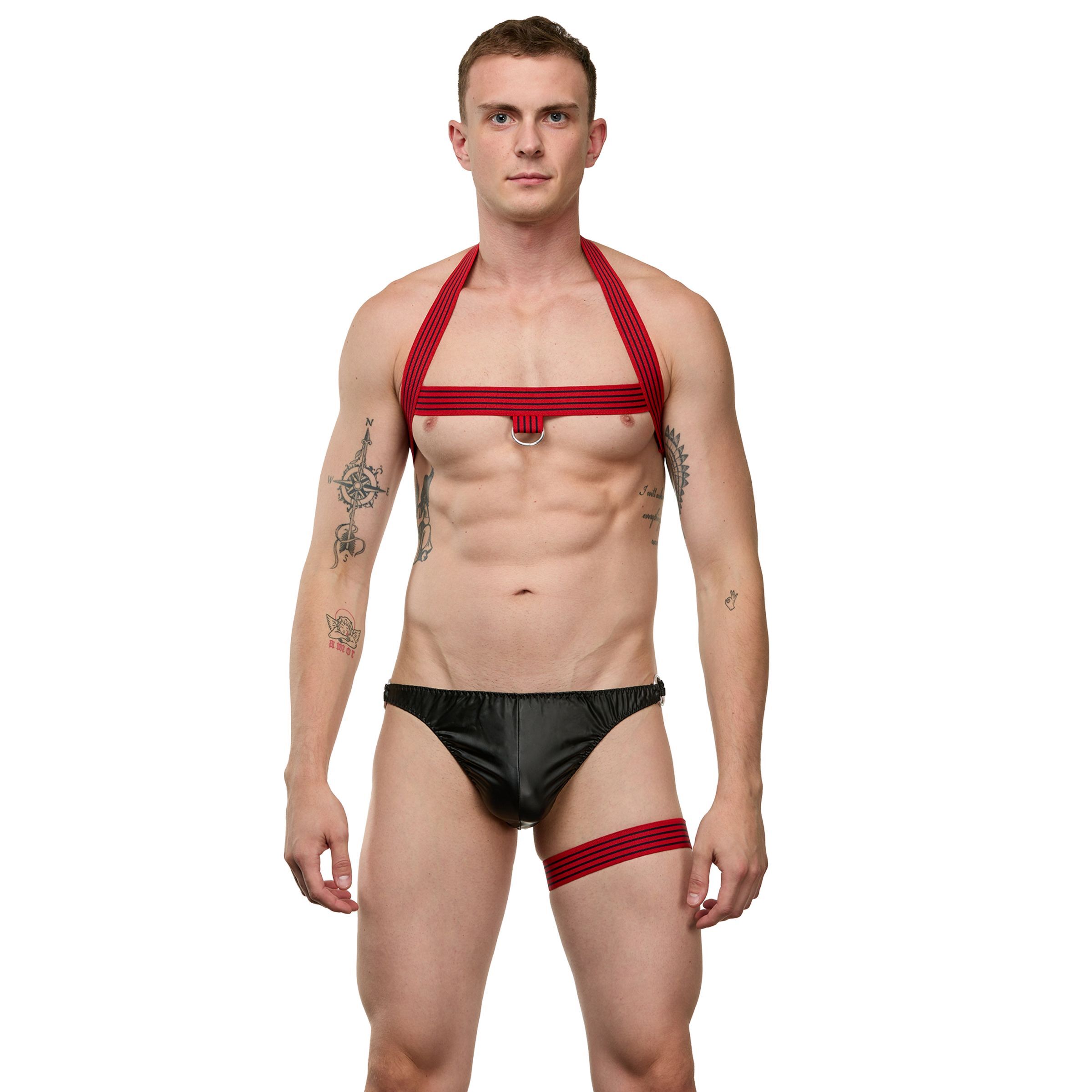 Этот комплект из трех предметов — трусы-тонги, подвязка на ногу и портупея — создан для тех, кто хочет подчеркнуть свою индивидуальность и добавить страсти в интимную жизнь. Яркое сочетание черного и красного цветов придает образу дерзкий и сексуальный вид.