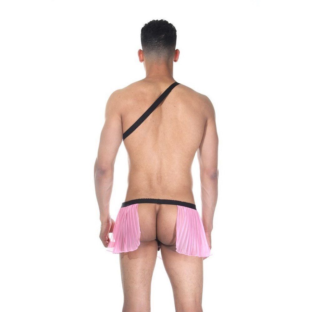 Костюм идеально подходит для романтических вечеров и тематических вечеринок. Он состоит из плиссированной юбки на черном поясе с открытыми ягодицами и черно-розовой повязки, которая одевается на верхнюю часть тела. Благодаря своему дизайну, костюм подходит для мужчин размером S-M, что делает его универсальным выбором для различных типов фигур.
