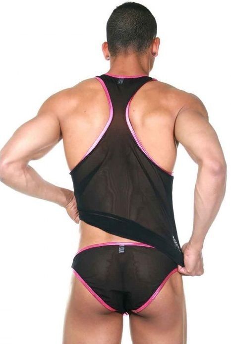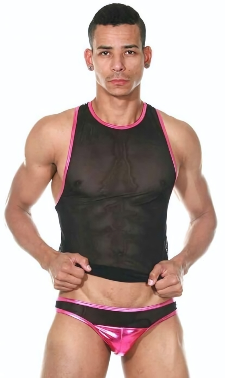 Майка-борцовка с розовой окантовкой и трусы-слипы с блестящими элементами подчеркнут вашу фигуру. Комбинация прозрачных и плотных тканей визуально моделирует силуэт, сохраняя свободу движений.