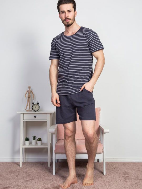 Комплект состоит из футболки с коротким рукавом и классическим круглым вырезом и шорт длиной выше колена. Свободный крой не сковывает движений, поэтому модель подходит как для сна, так и для активного домашнего отдыха. Шорты удобно сидят по фигуре, а футболка в тонкую горизонтальную полоску добавляет образу аккуратности.