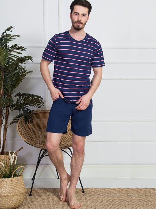 Мужской комплект Vienetta создан для тех, кто ценит удобство и аккуратный внешний вид даже дома. Футболка в узкую полоску и однотонные шорты формируют стильный и спокойный образ, в котором приятно отдыхать после рабочего дня, проводить выходные или наслаждаться домашним уютом.