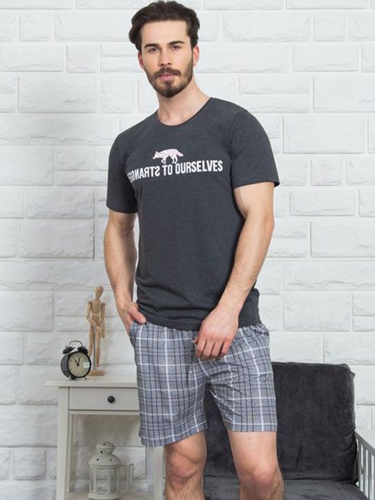 В комплект входят футболка с принтом на груди и шорты в серо-белой клетке. Размер — XL, цвет — темно-серый. Модель подойдет мужчинам, которые выбирают практичную домашнюю одежду с продуманным кроем и комфортной посадкой.