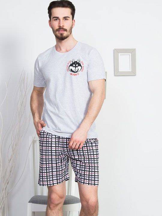 В комплект входит футболка с коротким рукавом и шорты до колена. Футболка выполнена в темно-сером цвете и дополнена аккуратным принтом на груди, который придаёт образу индивидуальность. Шорты в мелкую клеточку смотрятся стильно и при этом остаются универсальными для домашнего гардероба. Такой комплект подойдёт для сна, отдыха и повседневных домашних дел.