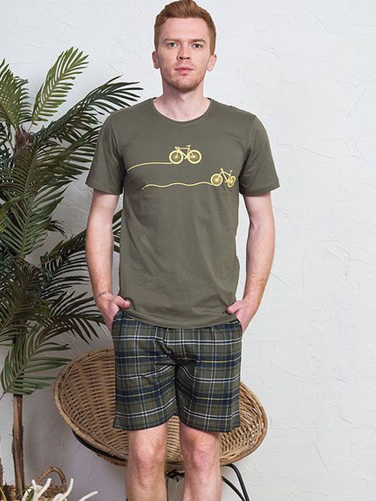 В комплект входят футболка с коротким рукавом и шорты. Футболка выполнена в синем цвете и дополнена аккуратным принтом с изображением велосипедов, что придаёт образу лёгкость и динамичный характер. Шорты в клетку гармонично сочетаются с верхом и подходят для повседневной носки дома. Модель размера S хорошо садится по фигуре, обеспечивая удобство в течение всего дня.