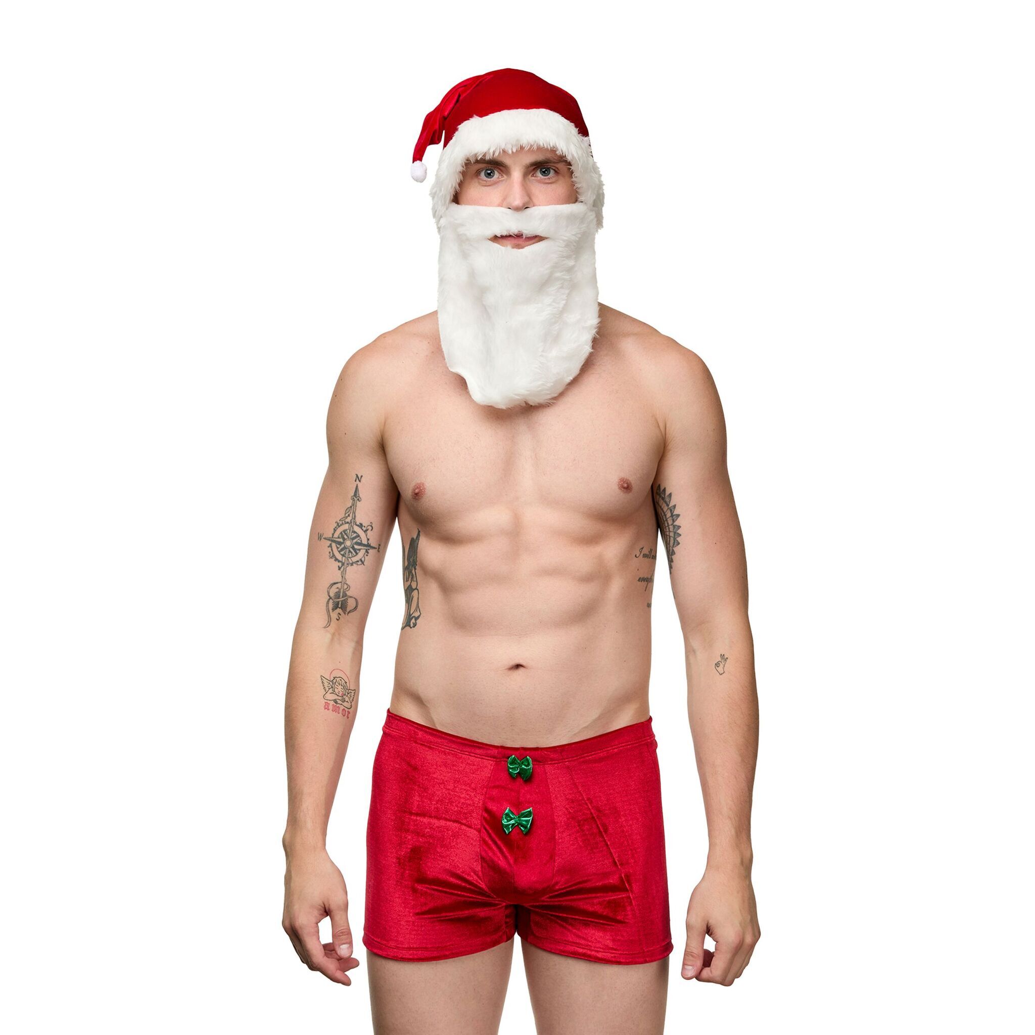 Этот уникальный мужской костюм «Дед Мороз» станет идеальным выбором для тех, кто хочет добавить немного игривости и веселья в свои эротические игры. Яркий красный цвет с белыми акцентами создает праздничное настроение, а удобный размер L-XL подходит для большинства мужчин. Костюм состоит из двух предметов: боксеров с вырезом сзади и шапки с бородой, что делает его не только привлекательным, но и практичным.